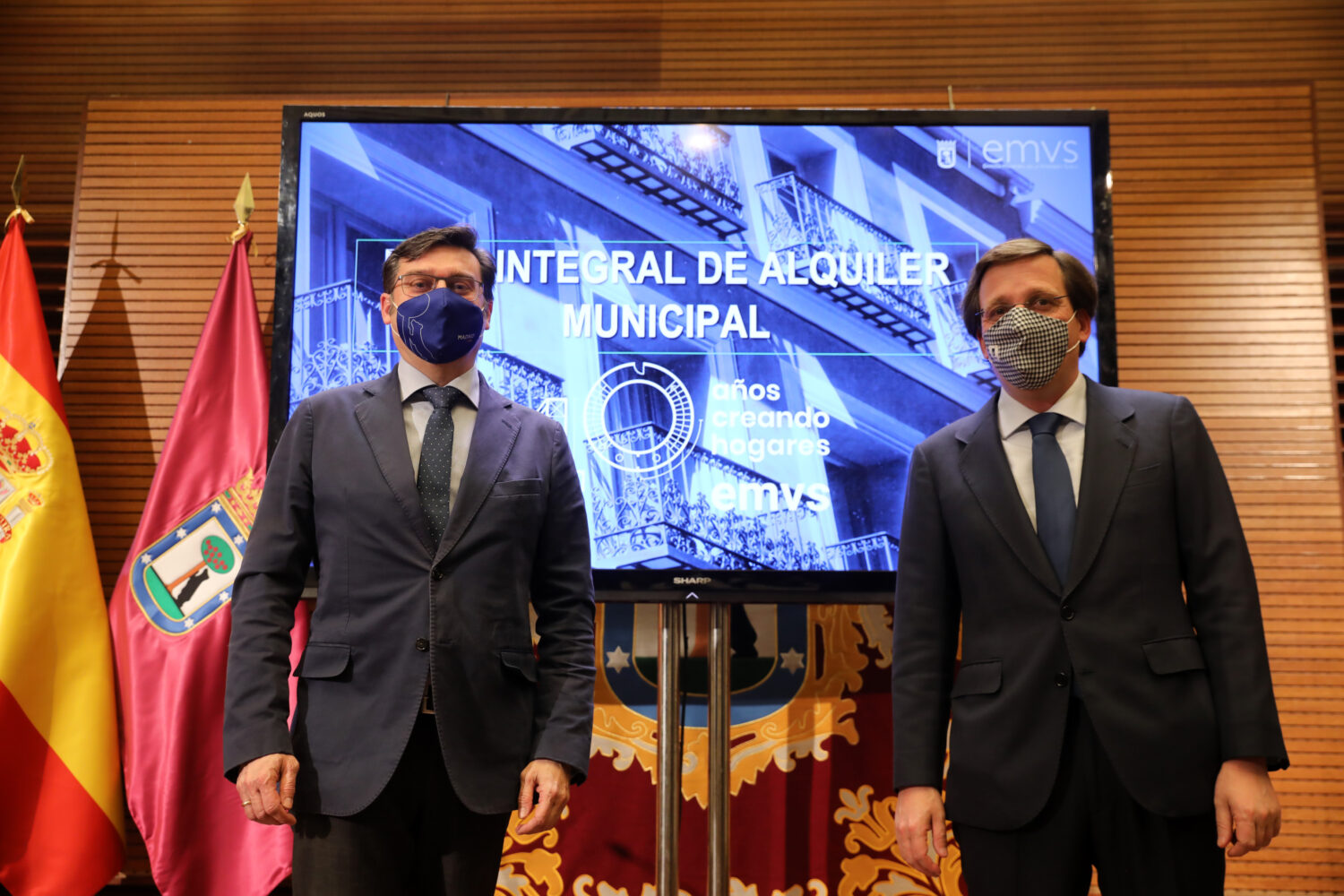 El alcalde de Madrid, José Luis Martínez-Almeida, y la vicealcaldesa, Begoña Villacís, han presentado este lunes, junto al delegado del Área de Desarrollo Urbano, Mariano Fuentes; el concejal del Área Delegada de Vivienda, Álvaro González, y el consejero delegado de la Empresa Municipal de Vivienda y Suelo (EMVS), Diego Lozano, la estrategia de vivienda para la ciudad en la que el Ayuntamiento pone todos los recursos disponibles para luchar contra el ascenso de precios del alquiler y para eliminar las barreras que tienen los jóvenes para emanciparse.