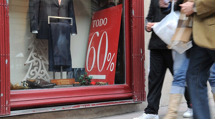 Foto de archivo de unos ciudadanos pasando por delante de un escaparate en época de rebajas e imágenes de la campaña