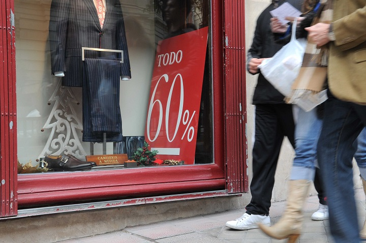 Foto de archivo de unos ciudadanos pasando por delante de un escaparate en época de rebajas e imágenes de la campaña