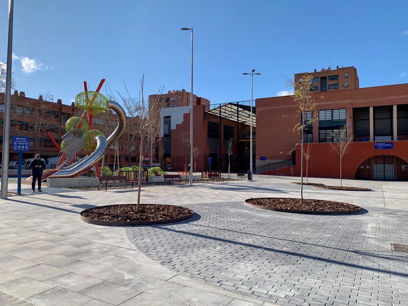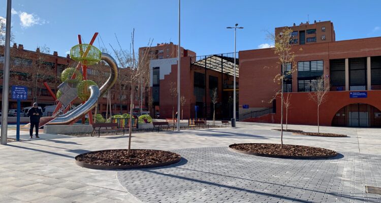 Además de recuperar el valor ambiental de la plaza, se han incrementado sus usos para dar cabida a los diferentes usuarios de este espacio público tan concurrido en el barrio del Pozo del Tío Raimundo, entre ellos el público infantil, para el que se ha instalado el juego singular ‘Torre cestas’, un elemento que otorga una imagen diferenciadora a la plaza.