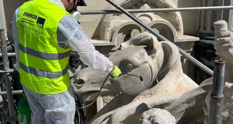 Los trabajos tienen como objetivo la limpieza parcial de la torre-mirador situada en el centro del monumento y sobre la que se erige la estatua ecuestre del monarca. Esta actuación se enmarca en el plan de conservación de los bienes culturales de titularidad municipal ubicados en el ámbito del Paisaje de la Luz, actualmente inmerso en un conjunto de proyectos destinados a implementar la gestión, investigación, conservación y difusión del bien.