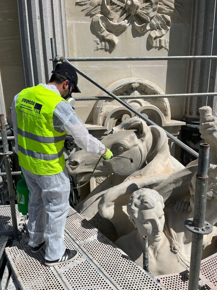 Los trabajos tienen como objetivo la limpieza parcial de la torre-mirador situada en el centro del monumento y sobre la que se erige la estatua ecuestre del monarca. Esta actuación se enmarca en el plan de conservación de los bienes culturales de titularidad municipal ubicados en el ámbito del Paisaje de la Luz, actualmente inmerso en un conjunto de proyectos destinados a implementar la gestión, investigación, conservación y difusión del bien.