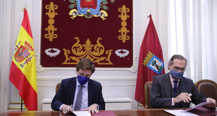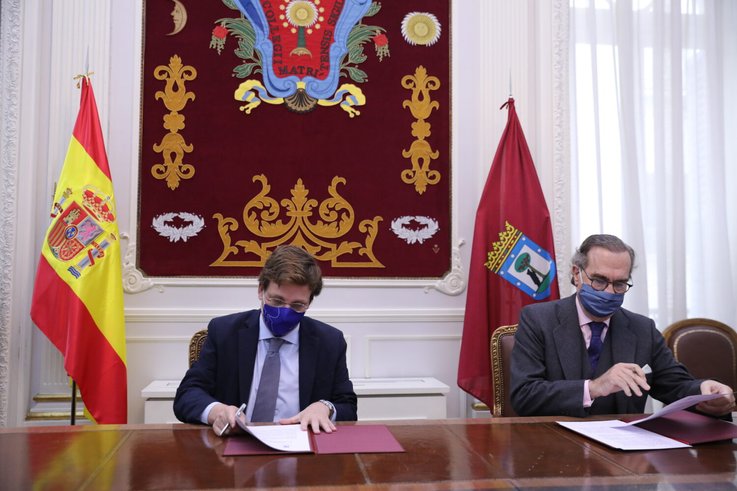 El alcalde ha sido testigo de la firma de un convenio entre el presidente de la Unión Interprofesional de la Comunidad de Madrid (UICM), José María Alonso, y el presidente de la Asociación Madrid Futuro, Manuel Bretón, por el que se establece la colaboración entre ambos organismos para contribuir, con los conocimientos, el talento y la experiencia de los profesionales y sus corporaciones, a aquellos proyectos y acciones que puedan ser de interés para ambas partes. /