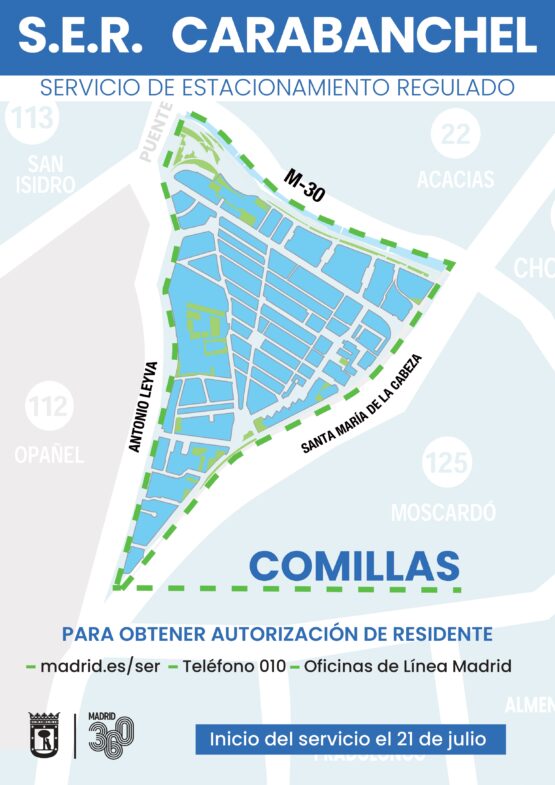 El Ayuntamiento de Madrid activa el próximo lunes, 21 de julio, el Servicio de Estacionamiento Regulado (SER) en el barrio de Comillas. La nueva zona dispondrá de 2.186 plazas de aparcamiento reguladas: 2.076 serán verdes y 110 azules.
