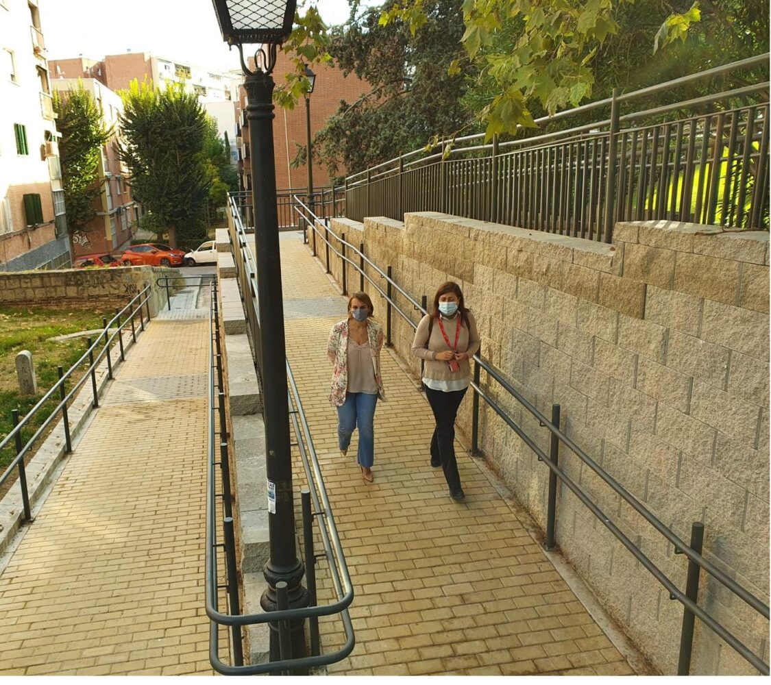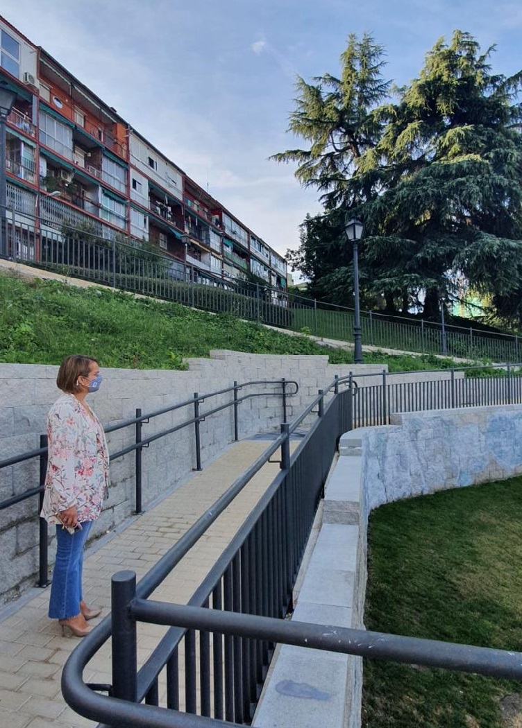 La concejala de Moncloa-Aravaca, Loreto Sordo, ha visitado hoy las nuevas rampas peatonales que se han instalado en las inmediaciones de las calles Aguilafuente y Azuaga, en el barrio de Valdezarza, para sustituir una larga escalera por nuevos itinerarios peatonales totalmente accesibles.