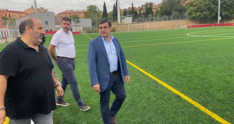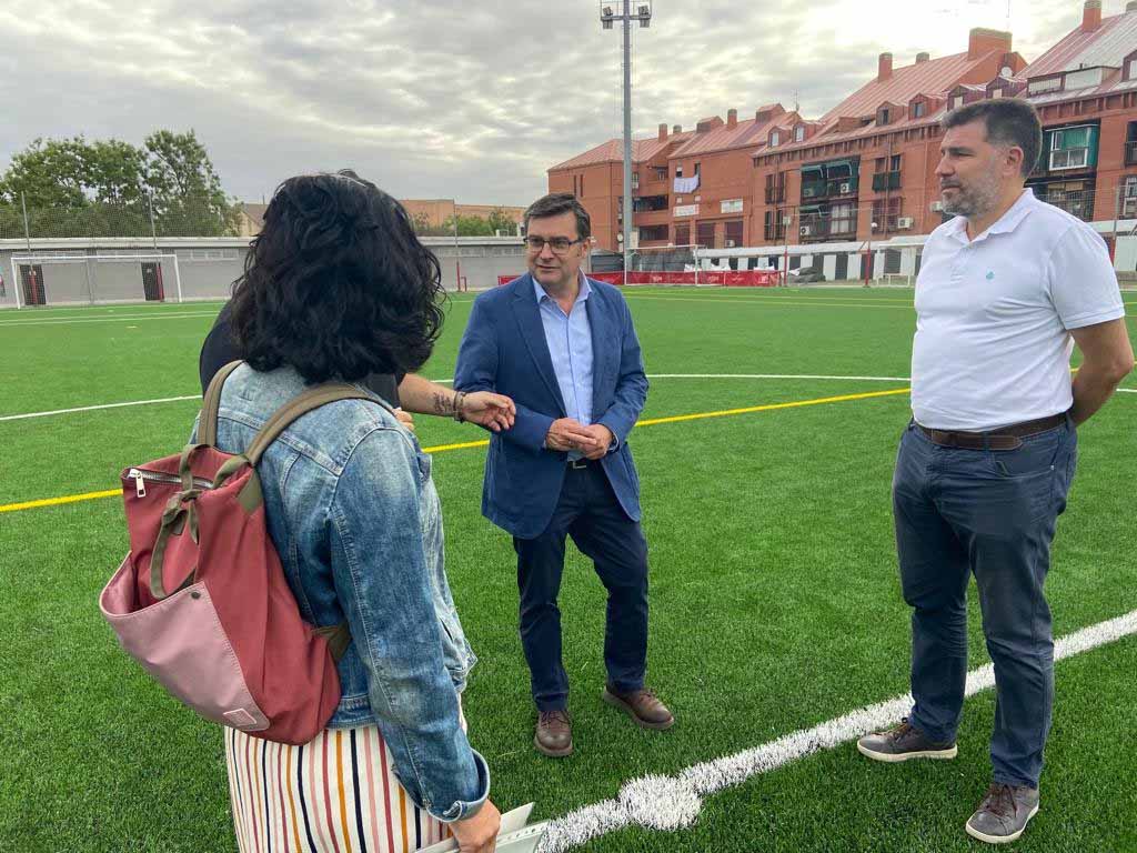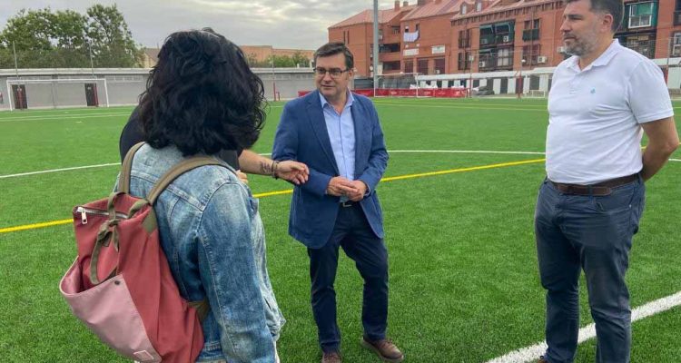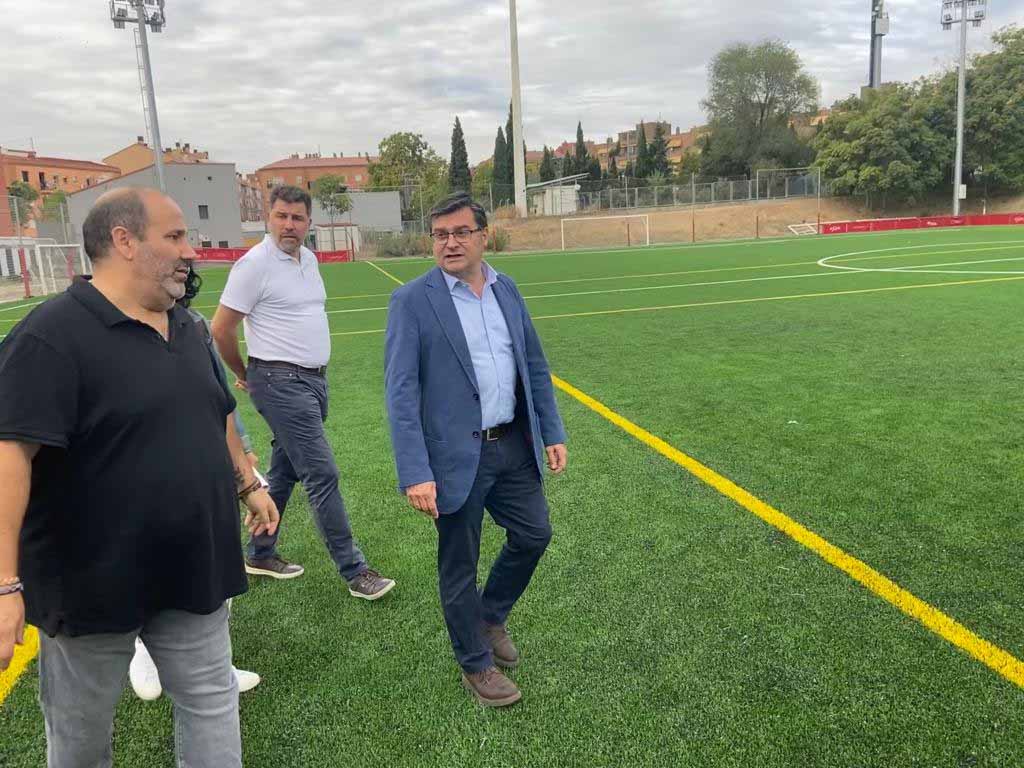 El campo de fútbol 11 de La Mina estrena césped este mes de septiembre. Esta mañana el concejal de Carabanchel, Álvaro González, ha visitado las obras que ha realizado este verano la Junta Municipal y que han contado con un presupuesto de 506.704 euros.