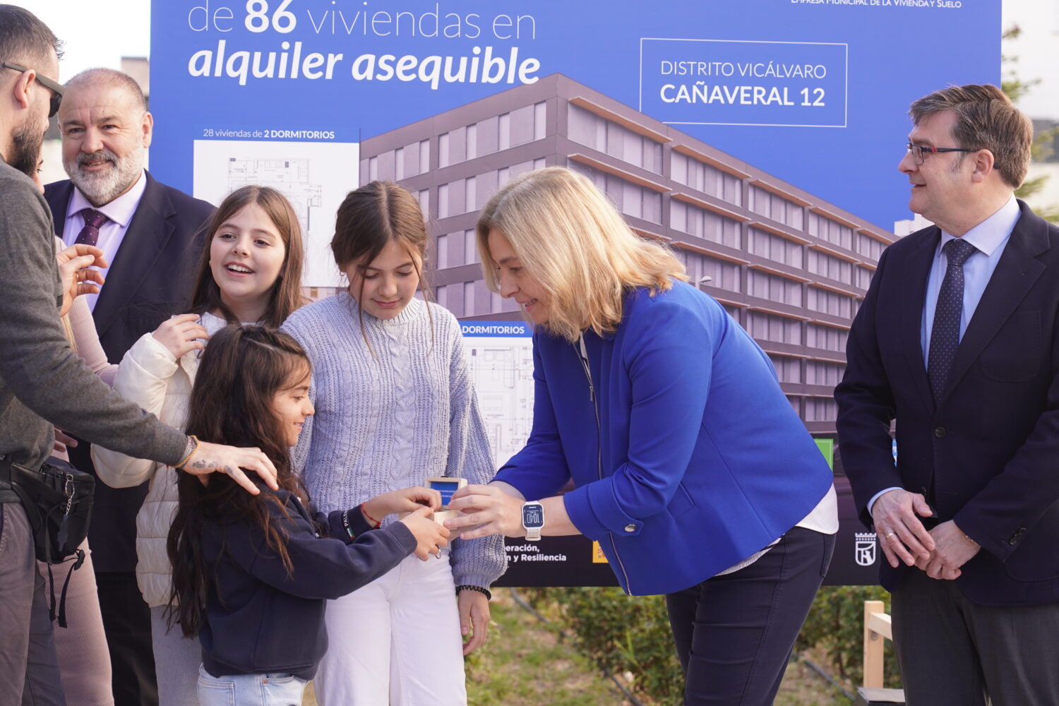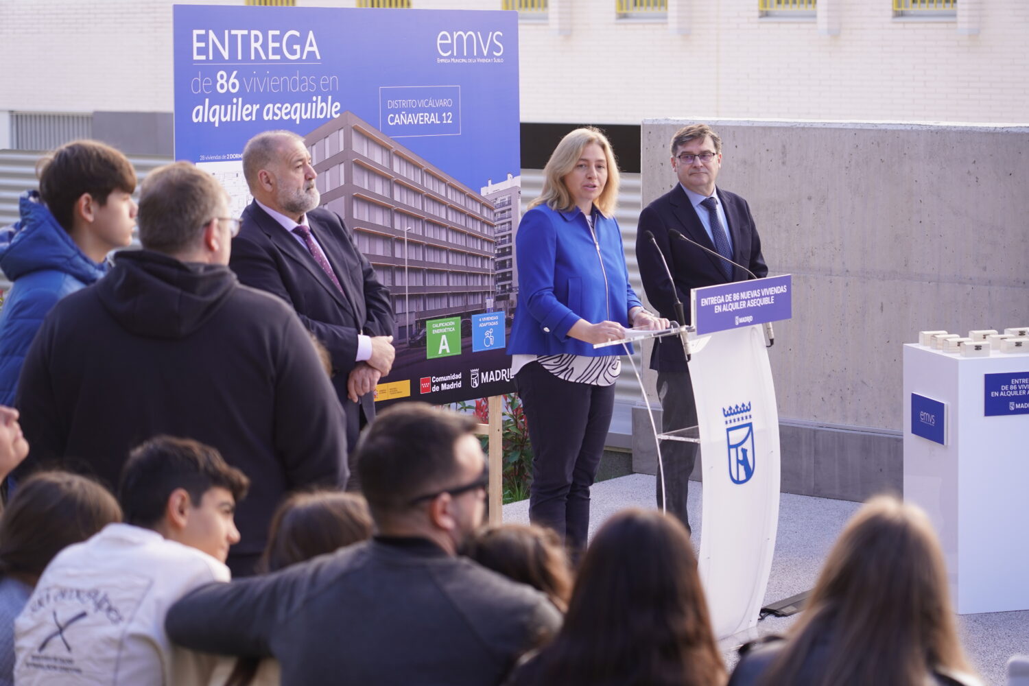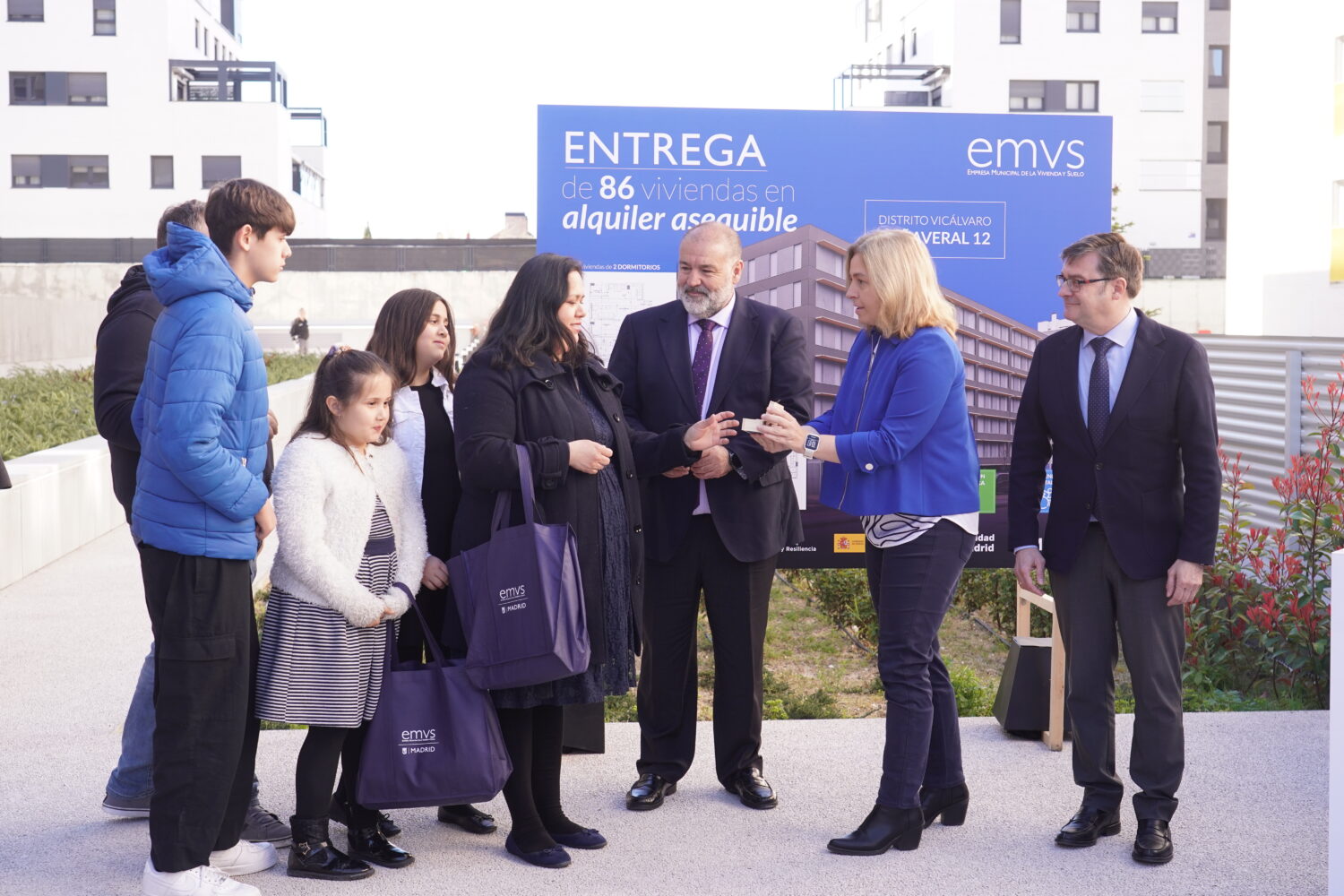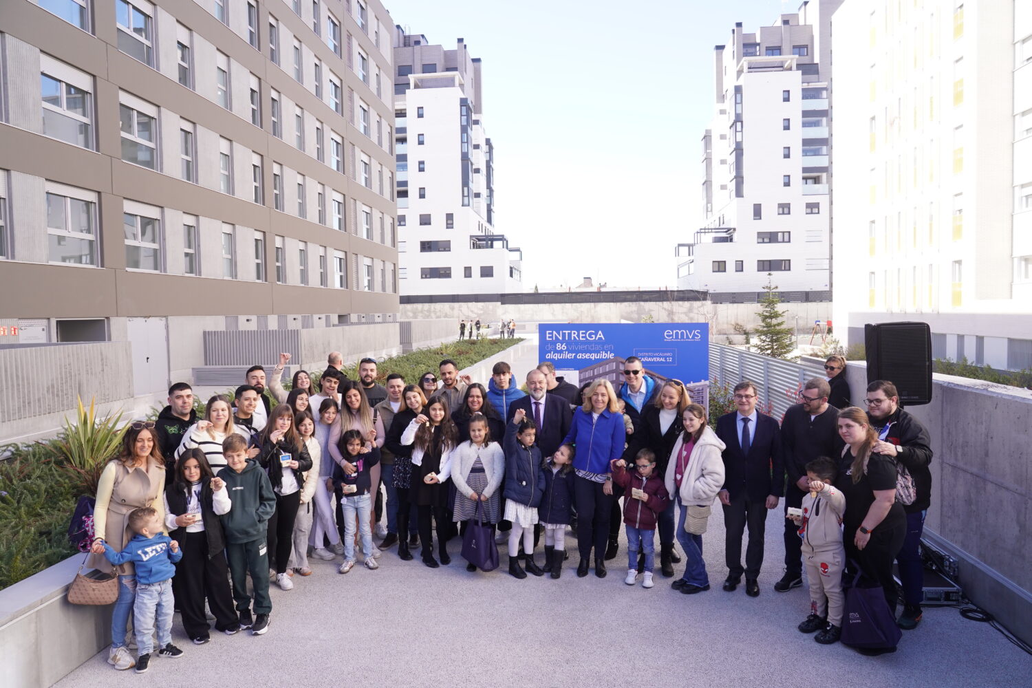 Más de 570 familias y jóvenes madrileños disfrutan ya de su hogar en una de las nuevas viviendas que el Ayuntamiento, a través de la Empresa Municipal de la Vivienda y Suelo de Madrid (EMVS Madrid), ha adjudicado en el barrio de El Cañaveral, en el distrito de Vicálvaro. Así lo ha destacado la vicealcaldesa de Madrid, Inma Sanz, tras entregar las llaves de sus nuevas casas a los adjudicatarios de la promoción Cañaveral 12, junto al delegado de Políticas de Vivienda y presidente de EMVS Madrid, Álvaro González. La nueva edificación cuenta con 86 viviendas públicas en régimen de alquiler asequible.