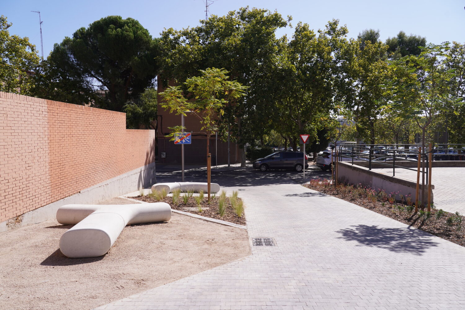 El fondo de saco que da acceso al colegio se ha peatonalizado, permitiéndose únicamente el acceso al vado del centro. Además, se han adecuado los pasos de peatones en la intersección de la calle de Alconera con la calle de Alberique y se ha creado un nuevo paso de peatones elevado frente a la instalación deportiva existente en la calle de Alconera.