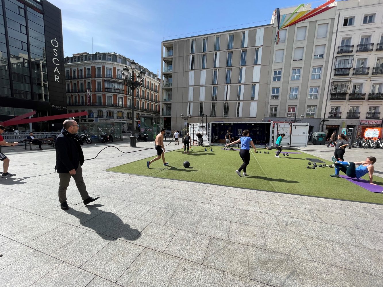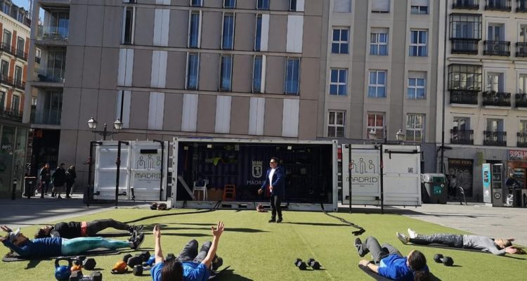 El concejal del distrito de Centro, José Fernández, ha visitado esta mañana el Cubo Gym Madrid, un espacio deportivo itinerante que, hasta el 21 de junio, está ubicado en la plaza de Pedro Zerolo. Este proyecto temporal instalado en el barrio de Justicia por el Área Delegada de Deporte ofrece actividades deportivas para mayores de 15 años, dirigidas por graduados o licenciados en Ciencias de la Actividad Física y el Deporte.