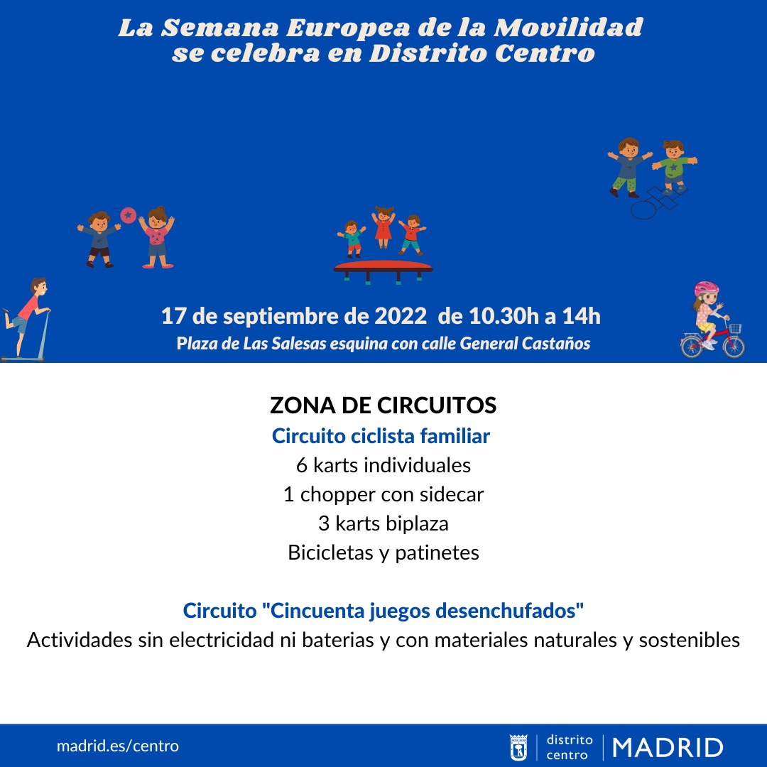 El próximo sábado 17 de septiembre el distrito de Centro celebra la Semana Europea de la Movilidad bajo el lema ‘Mejorando conexiones’. La jornada, que contará con actividades familiares e infantiles, se desarrollará en la plaza de Las Salesas con General Castaños, entre las 10:30 y las 14:00 h. Las actividades son gratuitas y se podrán realizar en familia y estarán coordinadas por monitores especializados.