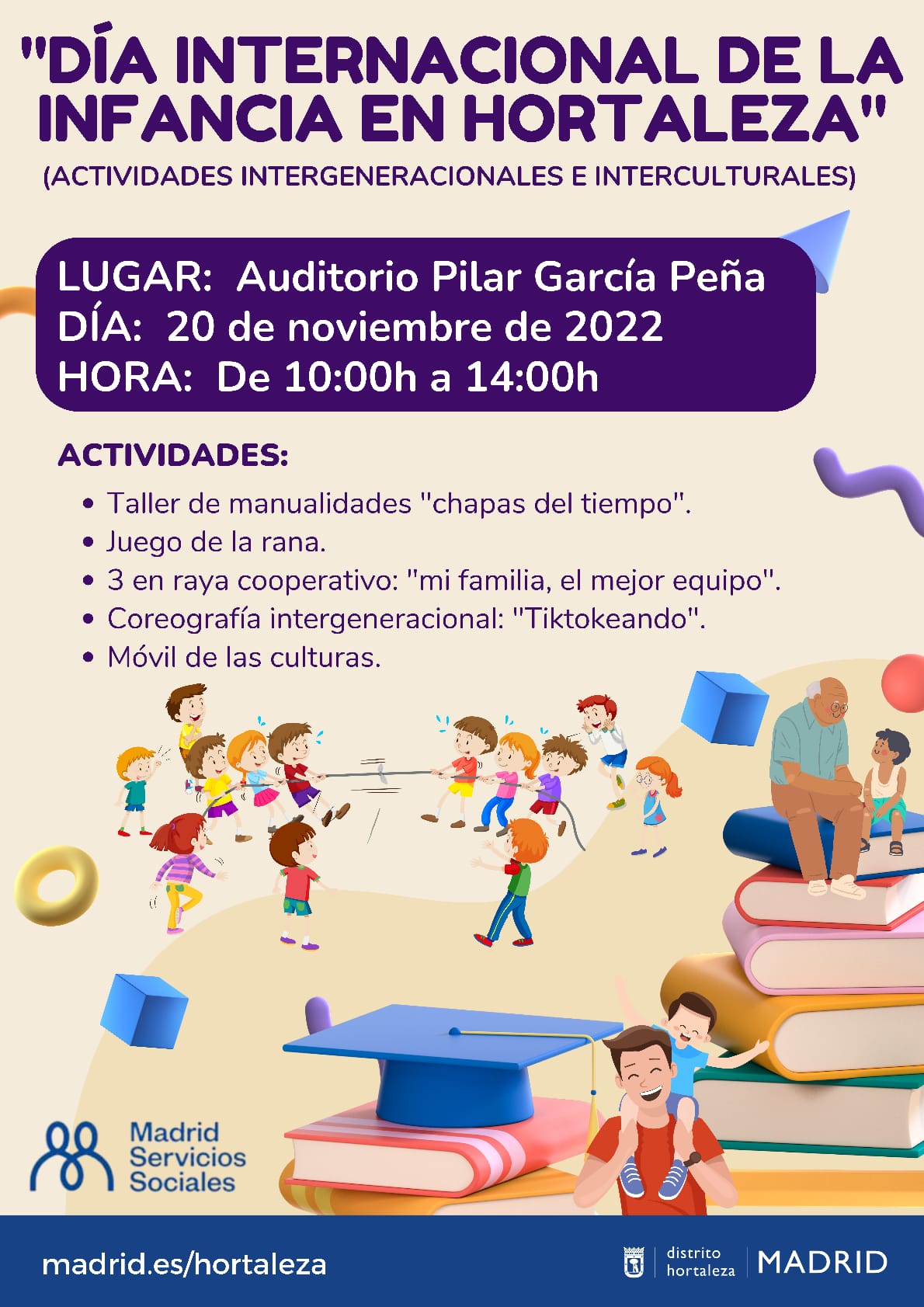 La Junta Municipal de Hortaleza celebrará el Día de la Infancia con una divertida jornada intergeneracional para que mayores y pequeños compartan unas horas de juegos tradicionales junto a propuestas más actuales. Las actividades se realizarán este domingo, 20 de noviembre, en el auditorio Pilar García Peña, de 10:00 a 14:00 h.