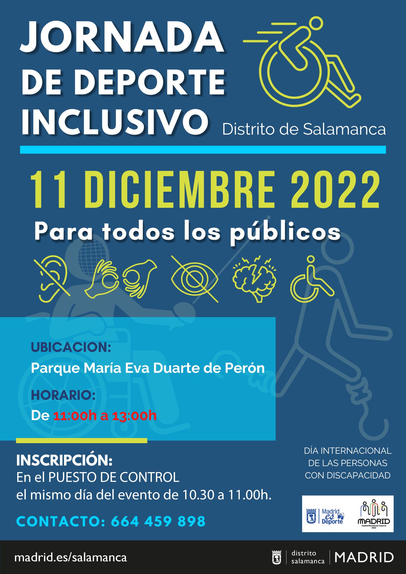 El próximo domingo 11 de diciembre el distrito de Salamanca celebra una jornada de deporte inclusivo para todos los públicos, con motivo de la conmemoración del Día Internacional de las Personas con Discapacidad que se ha celebrado el pasado día 3 de diciembre. La iniciativa busca dar a conocer y promover el deporte inclusivo, acercando su práctica a toda la ciudadanía. Las diferentes propuestas se llevarán a cabo en el parque Eva Duarte de Perón y en la instalación deportiva básica que se encuentra en el parque.