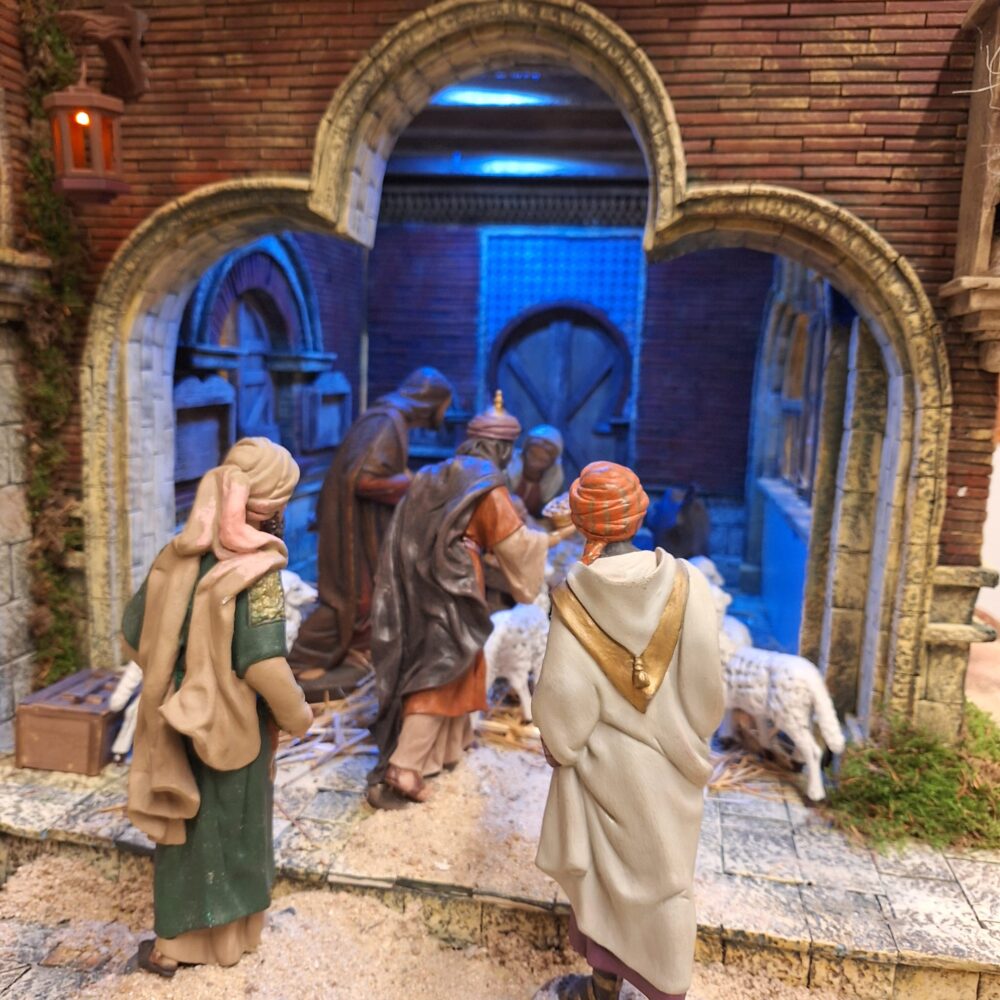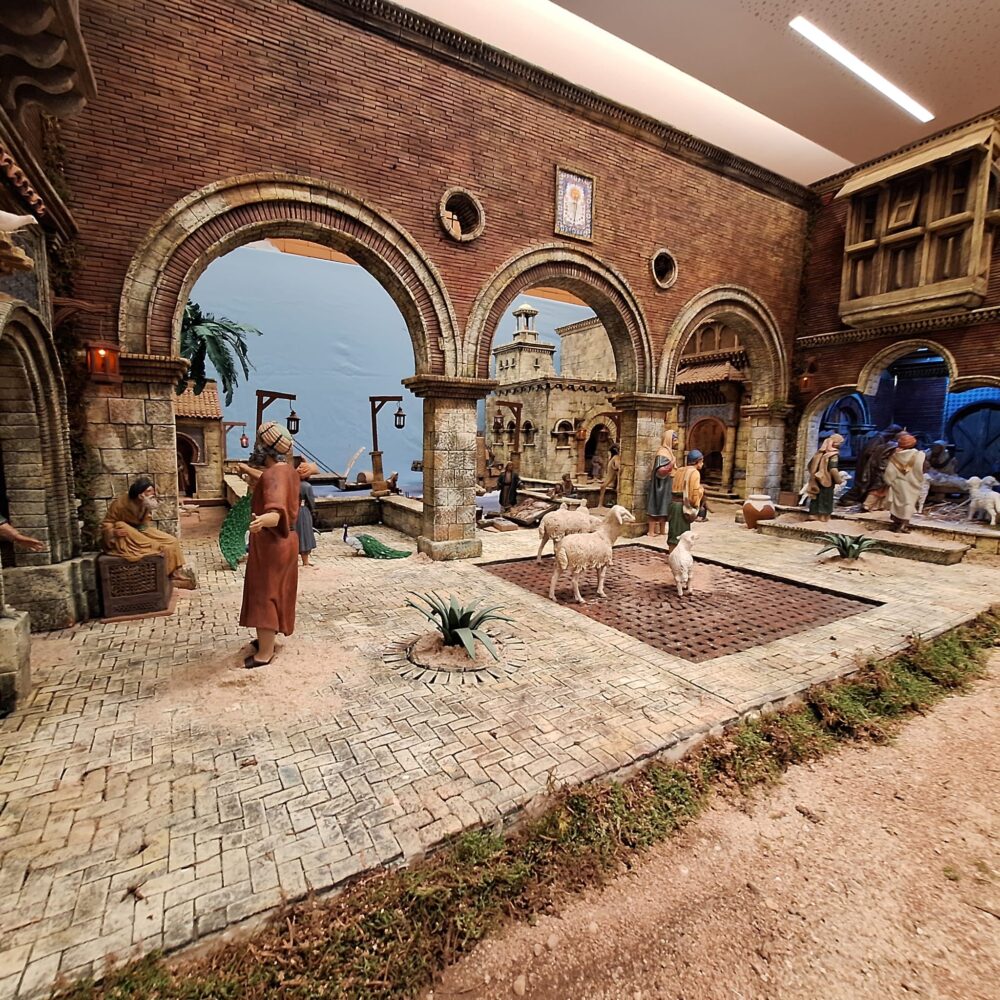 El nacimiento tradicional del distrito cuenta con figuras realizadas por prestigiosos artistas belenistas como José Luis Mayo, José Ángel Oviedo, Daniel López Alcántara o Montse García. Estas piezas representan escenas bíblicas y oficios de la época, así como diversas figuras de animales. Las construcciones del belén recrean el entorno con todo detalle, empleando materiales como corcho, musgo, arena, piedras y vegetación tanto artificial como natural. /