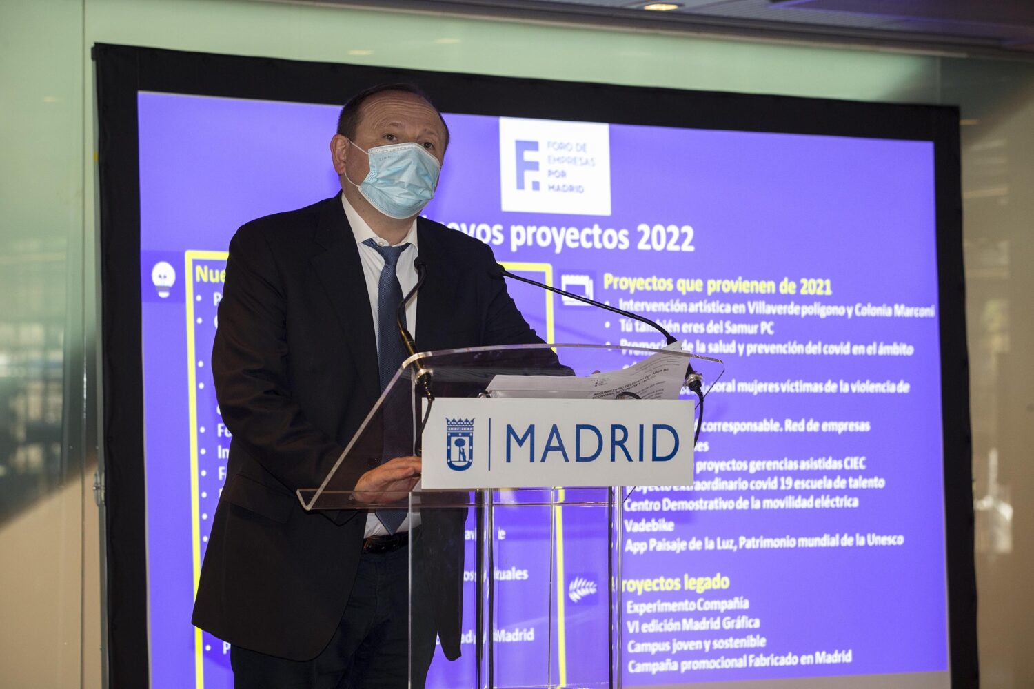 El delegado de Economía, Innovación y Emprendimiento ha explicado los nuevos proyectos a desarrollar durante el año 2022, entre los que “por primera vez, se incorporan tres proyectos que se desarrollarán en los distritos, por lo que ampliamos el ámbito de actuación del foro”. Así, los proyectos aprobados son: promoción de Zona Cero Emisiones; un Centro de Innovación y Transformación Digital de los Servicios; la difusión del proyecto Bosque Metropolitano; la ventanilla virtual para la atención a la empresa extranjera; el fomento de la movilidad ciclista; la inserción laboral para la autonomía residencial; el fomento de la movilidad sostenible y la energía renovable; la prevención del suicidio en adolescentes; el prototipo Leer Madrid; las Olimpiadas Escolares; Artrics Villa de Vallecas; la educación para la salud en entornos virtuales; Madrid Urban Sports 2022 y Patrimonio del Recuerdo.