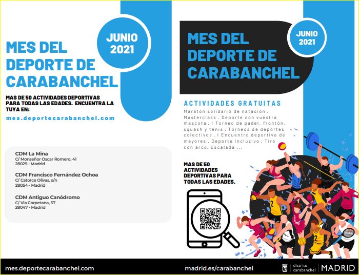 Entre otras pruebas, habrá un maratón solidario de natación, torneos de pádel, frontón, tenis y diversos deportes en grupo, encuentro deportivo de mayores, deporte inclusivo, pruebas de tiro con arco e iniciación a la escalada. La información completa puede encontrarse en el enlace https://mes.deportecarabanchel.com.
