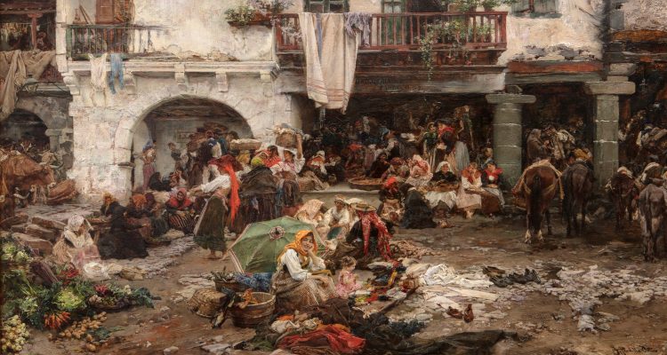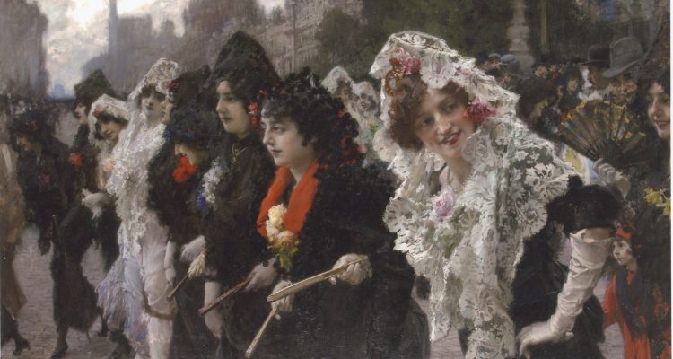 Pradilla fue aragonés de nacimiento, pero pasó una parte importante de su vida en Madrid. Recreó con sus pinceles vibrantes escenas costumbristas de la vida de la ciudad, cargadas de fuerza e intensidad y de las que el cuadro El Viernes Santo en Madrid. Paseo de mantillas (1914) que atesora el Museo de Historia y puede verse en esta muestra, constituye un gran ejemplo.