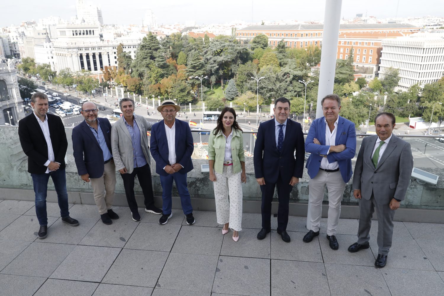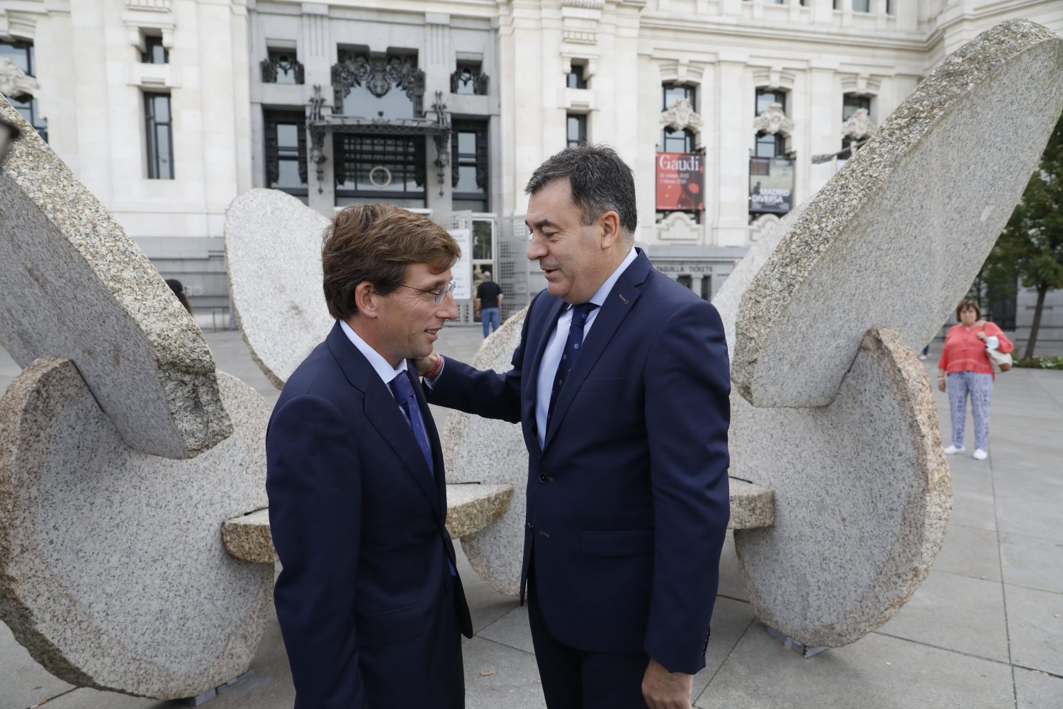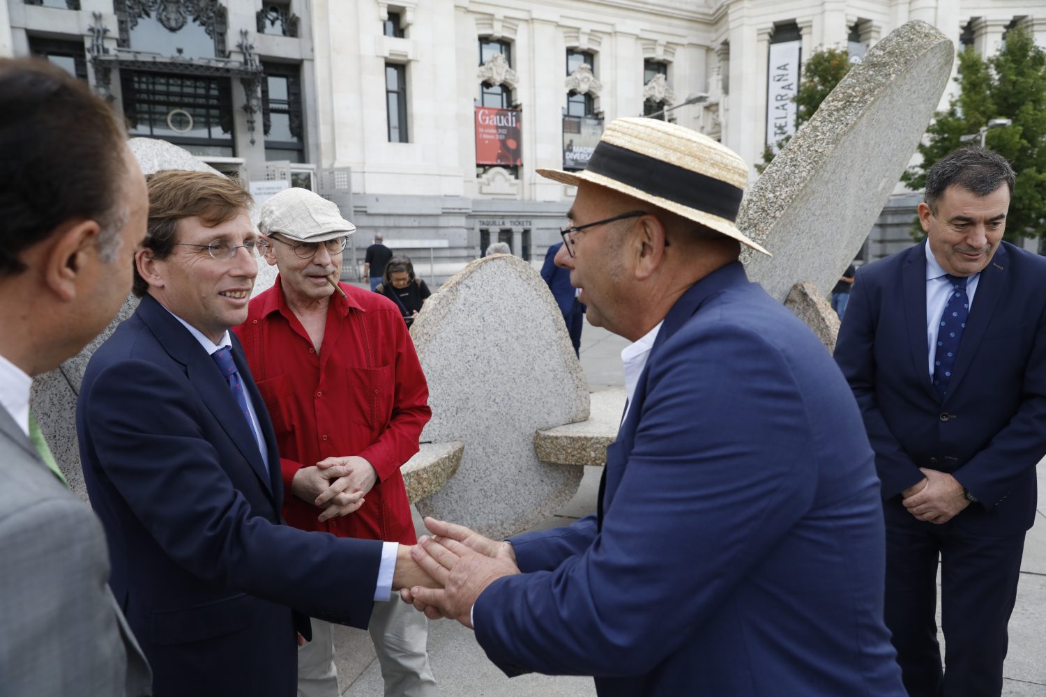 El alcalde de Madrid, José Luis Martínez-Almeida, acompañado por la delegada del Área de Cultura, Turismo y Deporte, Andrea Levy, el consejero de Cultura, Educación, Formación Profesional y Universidades de la Xunta de Galicia, Román Rodríguez, y el propio artista, han recorrido un tramo del paseo del Prado para conocer algunas de las esculturas de la muestra.