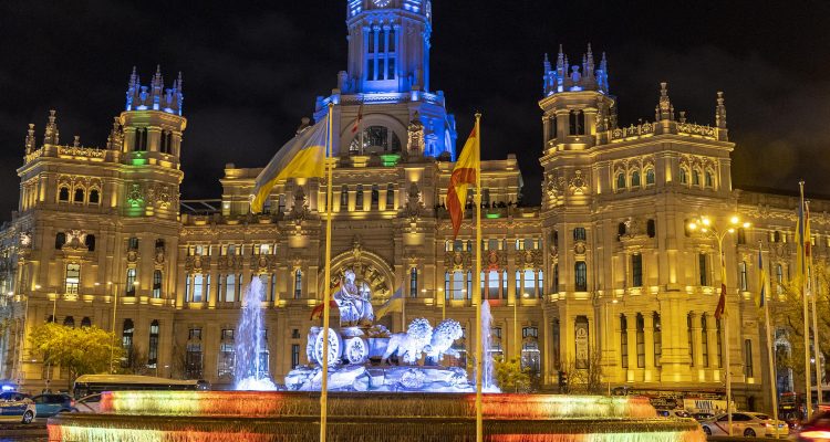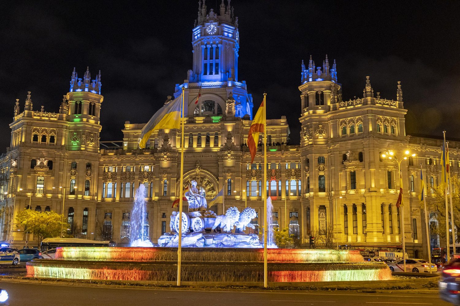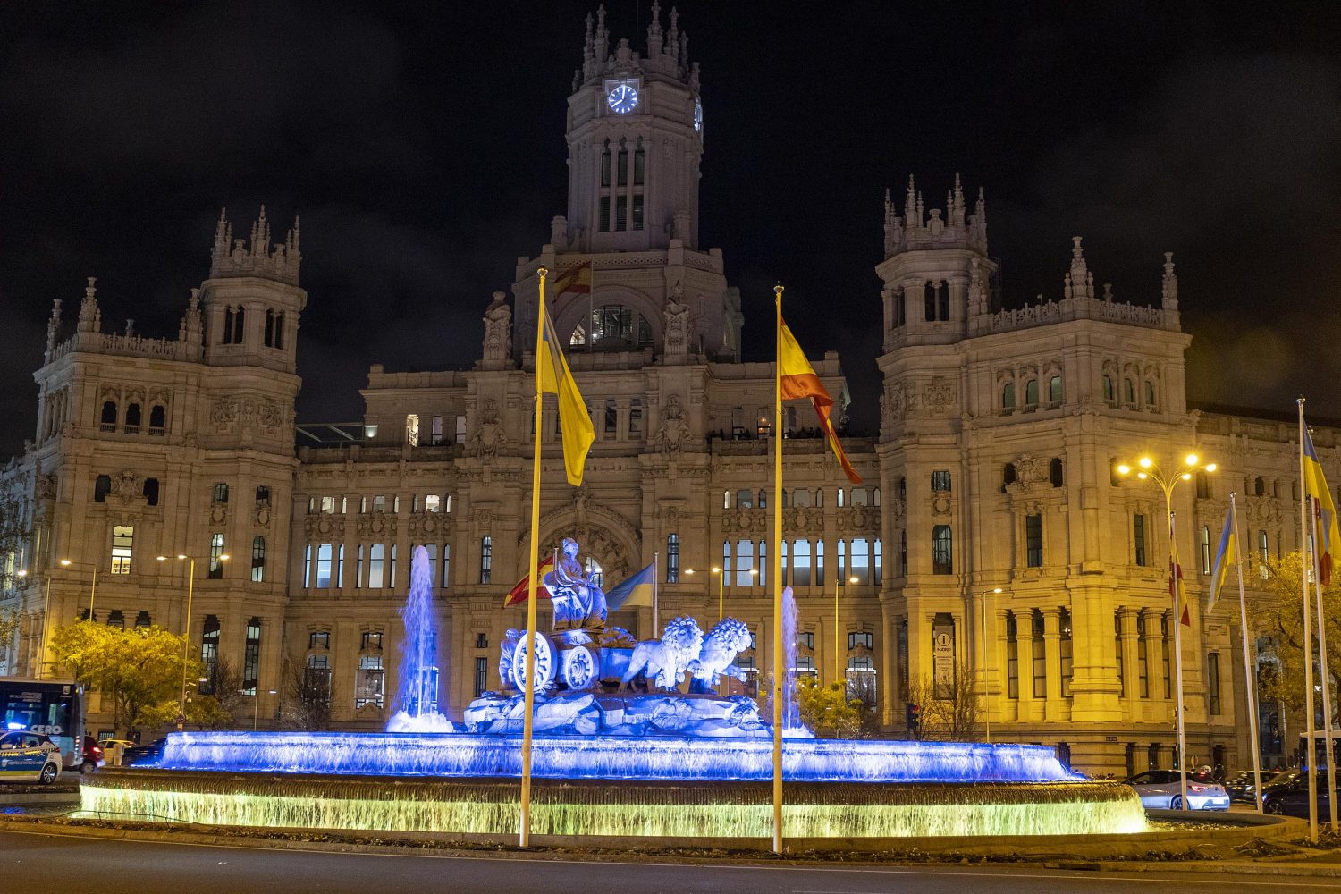 El Ayuntamiento de Madrid ha apagado esta tarde durante un minuto la iluminación del Palacio y la Fuente de Cibeles como muestra de solidaridad de la capital de España con el pueblo ucraniano y, a continuación, ha proyectado los colores de su bandera durante otro minuto.
