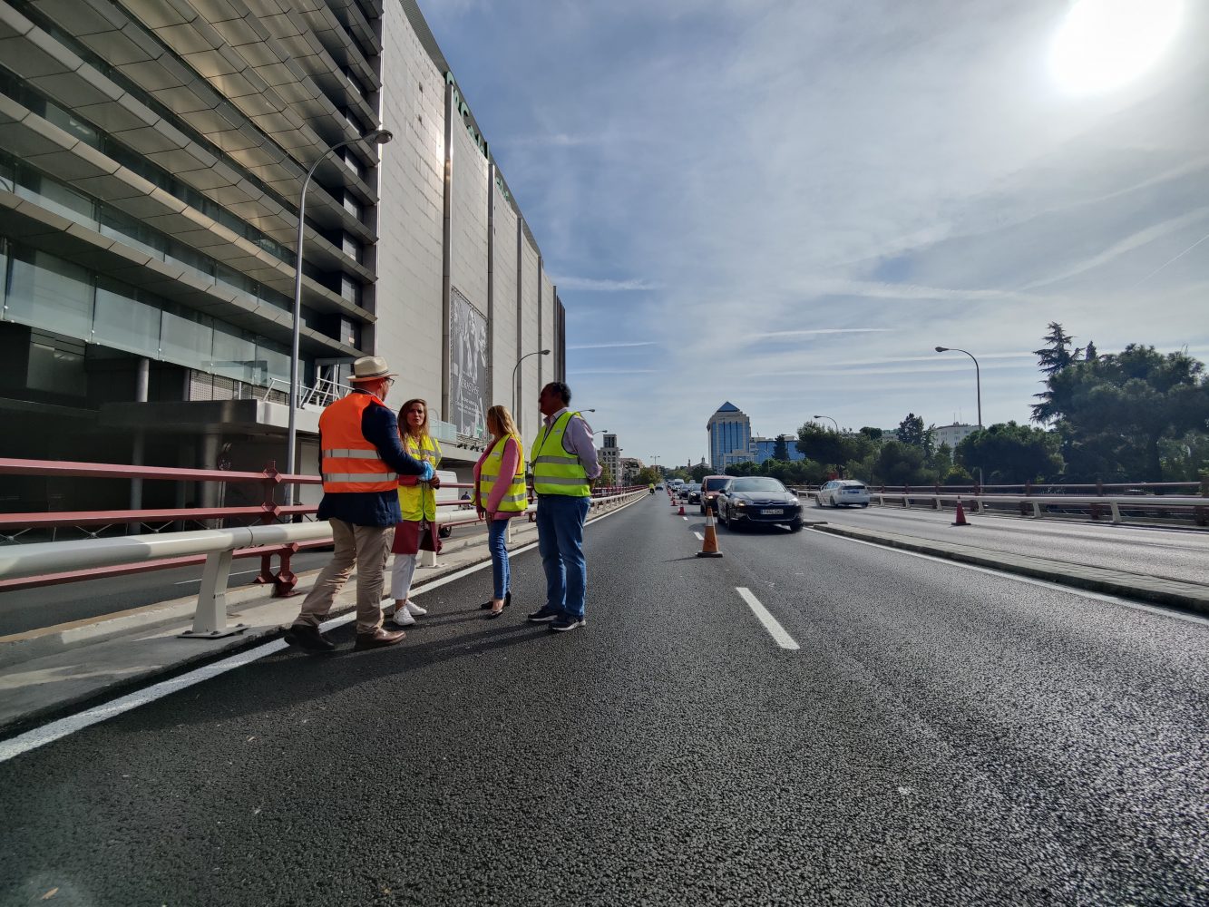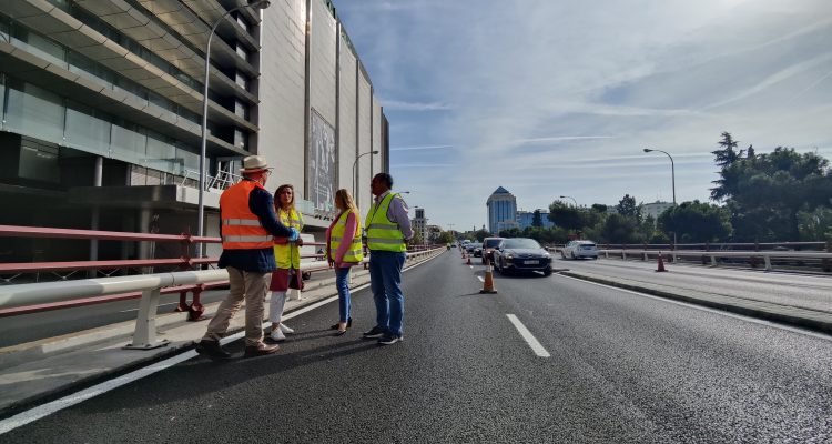 A la vez, se ha procedido al acondicionamiento de la parte superior del tablero del puente, que se encontraba deteriorado y envejecido por el paso del tiempo. En este caso, la intervención ha contemplado la renovación de la mediana, con demolición de la antigua y ejecución de una nueva, mejorando los puntos de recogida de agua del sistema de drenaje; restauración de las barandillas existentes en muretes de acceso y bordes laterales de tablero; ejecución de nuevas juntas de dilatación en el tablero; sustitución de la actual barrera metálica por un nuevo sistema de contención de vehículos más estético y ajustado al entorno urbano y a los requisitos la Unión Europea y renovación del pavimento de calzada existente con fresado y extensión de nueva capa de rodadura de asfalto y señalización horizontal.