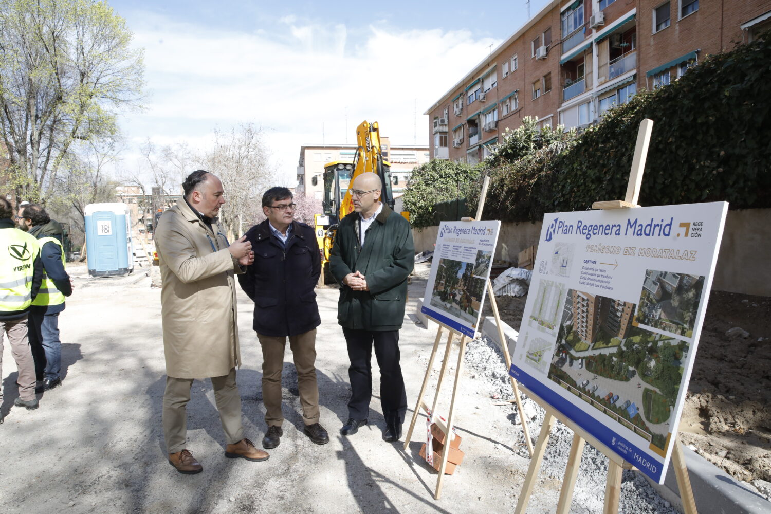 Visita del delegado de Políticas de Vivienda y presidente de la Empresa Municipal de la Vivienda y Suelo (EMVS Madrid), Álvaro González, acompañado del concejal de Moratalaz, Nacho Pezuela, a las obras de regeneración urbana que el Plan Regenera Madrid está llevando a cabo en este distrito