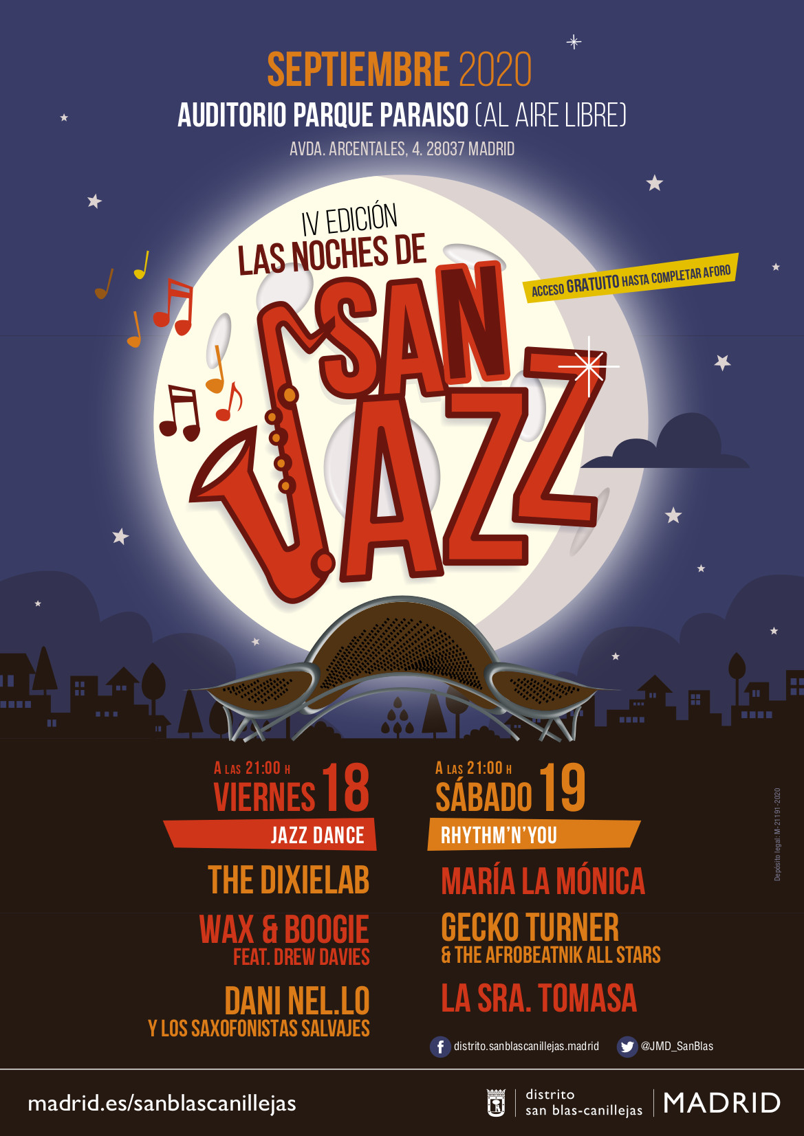 La Junta del Distrito de San Blas-Canillejas ha organizado la cuarta edición de Las Noches de San Jazz, que este año se celebrará los días 18 y 19 de septiembre en el Auditorio Parque Paraíso. El festival dedicará cada noche a un aspecto temático distinto. La propuesta de este año girará en torno al ritmo, centrándose la primera velada en el jazz dance y la segunda en una visión más personalizada del rhythm’n’you.