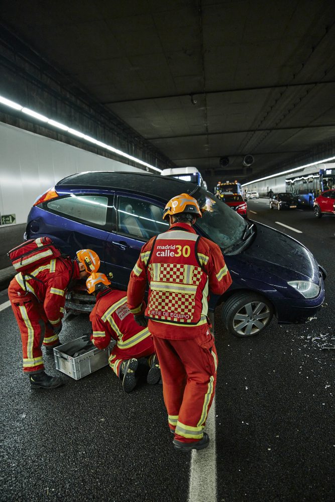 En una primera parte, se ha detectado un accidente con varios vehículos implicados y heridos de diversa consideración, lo que ha bloqueado la circulación en el túnel, dejando a cientos de personas atrapadas en su interior. En un segundo momento, uno de los vehículos ha derramado a la calzada hipoclorito, lo que ha obligado a cambiar el procedimiento de actuación sobre la marcha. Por último, se ha procedido a la evacuación de todos los usuarios, entre ellos los 170 ocupantes de tres autobuses de la EMT, lo que ha convertido al simulacro en la mayor evacuación de personas que se ha llevado a cabo en un túnel urbano en España hasta la fecha.