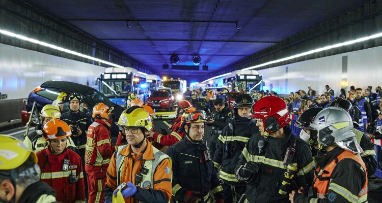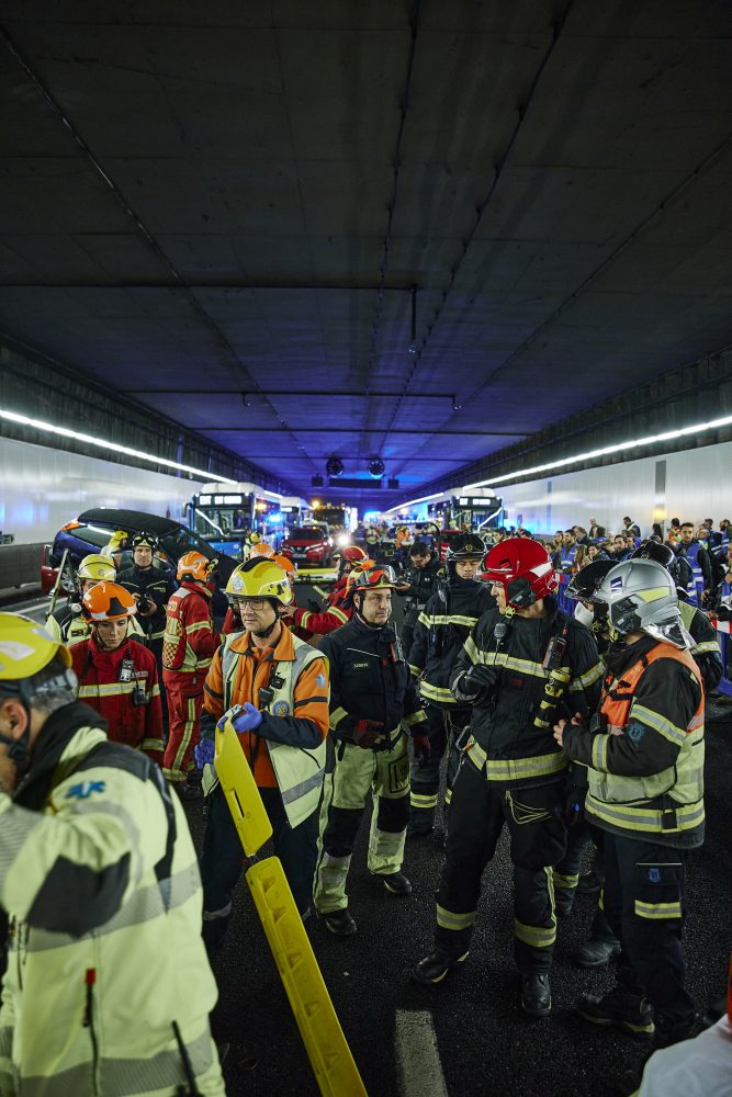 En el simulacro han participado los más de 100 profesionales que forman los equipos de Primera Intervención y del Centro de Control, ambos de Madrid Calle 30, Bomberos del Ayuntamiento de Madrid, Policía Municipal, SAMUR-Protección Civil y el Centro de Gestión de la Movilidad. Además, la Sección de Apoyo Aéreo de la Policía Municipal ha colaborado poniendo en práctica la primera experiencia piloto que supone el uso de drones dentro de un túnel urbano.