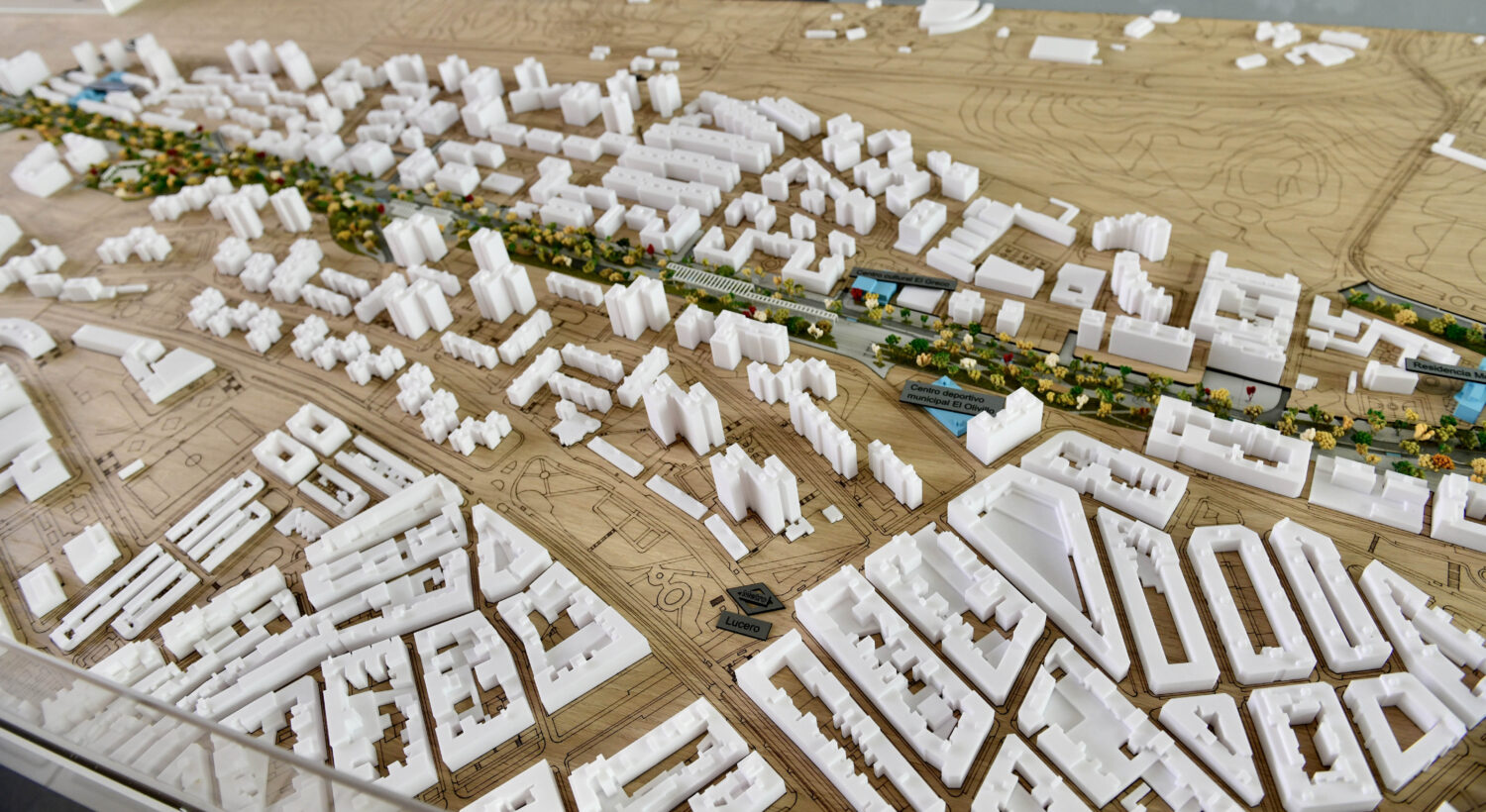 Detalles del Paseo Verde del Suroeste (de izquierda a derecha): maqueta, planta longitudinal con los nodos y, bajo tierra y en superficie