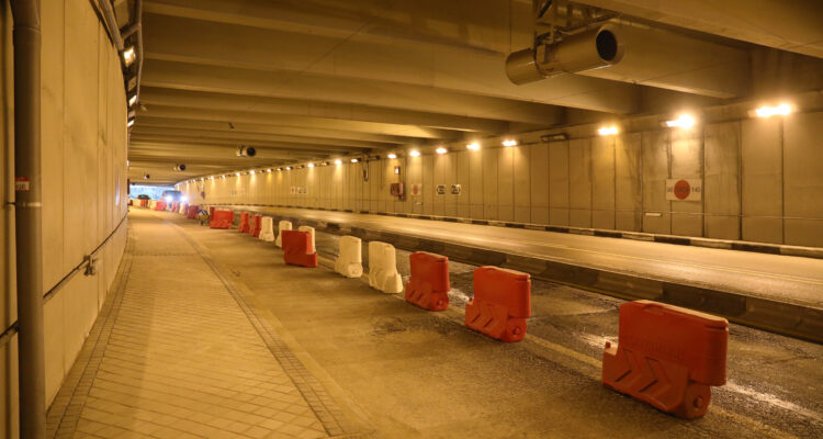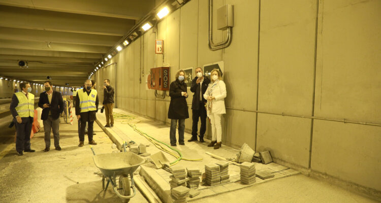 La solución proyectada consiste en la implantación de una acera junto al lateral este del túnel, generando un itinerario accesible de dos metros de ancho, frente a los 0,5 metros anteriores. Para ello, se redistribuirán los carriles de calzada existentes, manteniendo el mismo número pero con sección diferente. Asimismo, se ejecutará una nueva mediana.