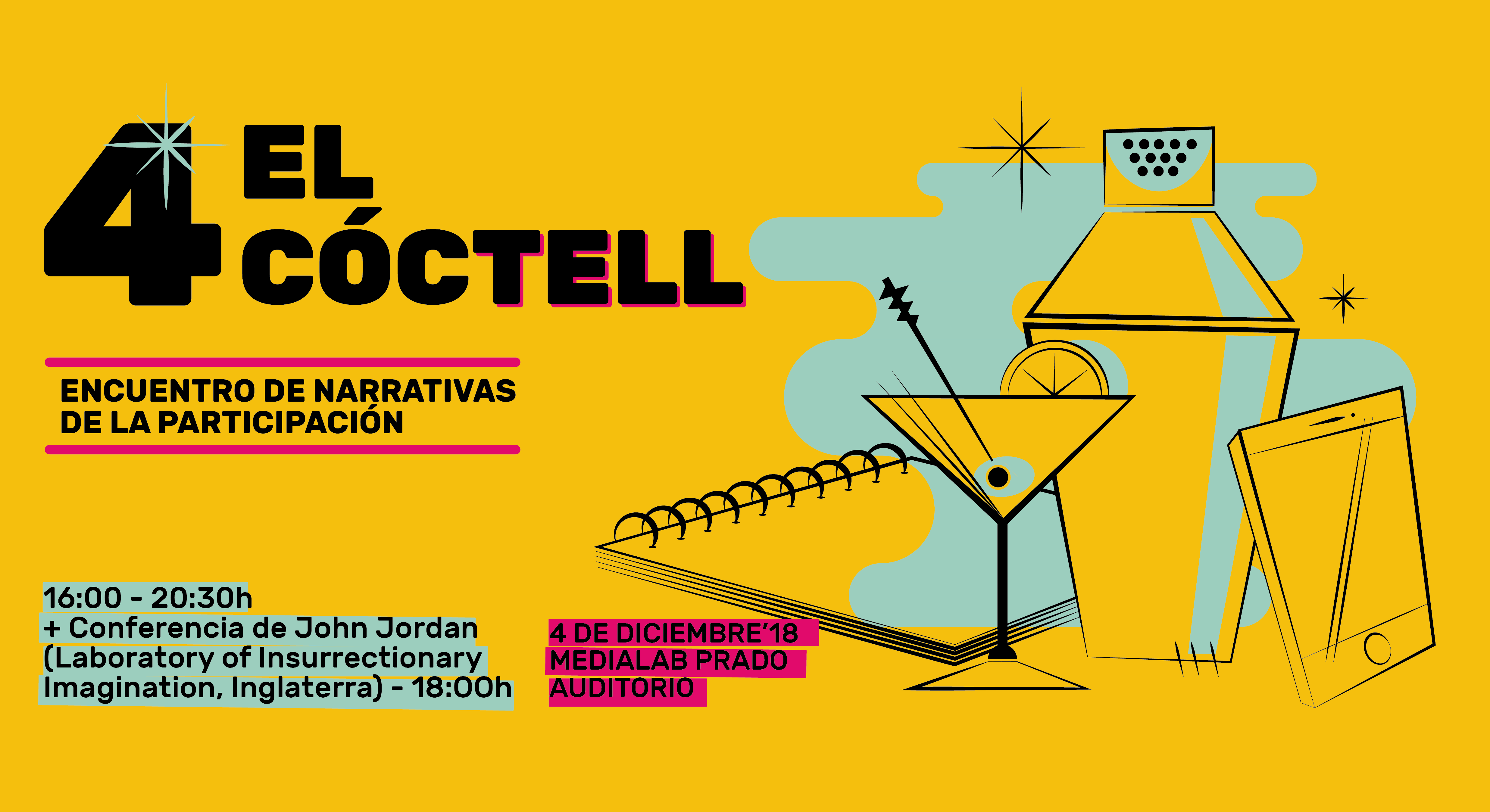16.00 hs.- CocTELL 4, narrativas para la innovación democrática. El encuentro servirá para trabajar los imaginarios de la innovación democrática del siglo XXI. John Jordan, del Laboratory of Insurrectionary Imagination de Londres, dará una conferencia a las 18.00 horas (sin traducción simultánea). El cocTELL 4 abordará el paradigma de la radicalidad democrática, sus diferentes formas de gobernanza y sus mecanismos colectivos: procesos descentralizados, procesos bottom up, desintermediación, asamblearismo, rotatividad de lideratos, deliberación, democracia por sorteo o feminización de la política, entre otros. En el encuentro se pensará de forma colectiva cómo construir un relato para la radicalidad democrática a partir de la producción transmedia de contenidos. Cualquier persona interesada puede participar. ¿Dónde? Medialab Prado. Alameda, 15. Más información: https://www.medialab-prado.es/actividades/coctell-4-narrativas-para-la-innovacion-democratica