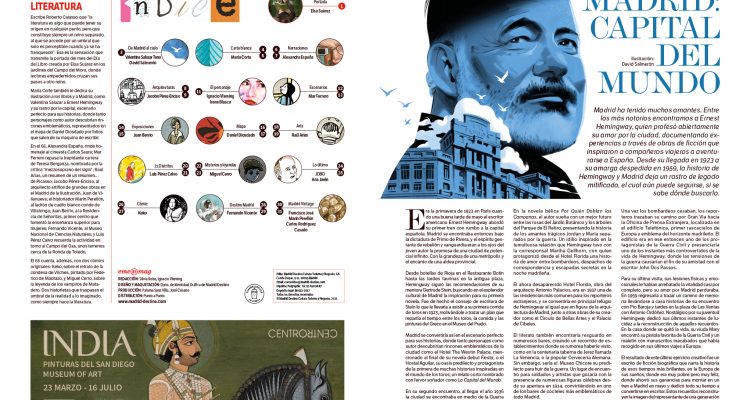 Un artículo de la periodista Valentina Salazar, con ilustraciones de David Salmerón, afirma que Madrid ha tenido muchos amantes y uno de los más notorios es Hemingway. “En la novela bélica Por quién doblan las campanas, el autor sueña con un mejor futuro entre las rosas del Jardín Botánico y los árboles del parque del Retiro, presentando la historia de los trágicos amantes Jordan y María separados por la guerra”, asegura al hablar del literato.