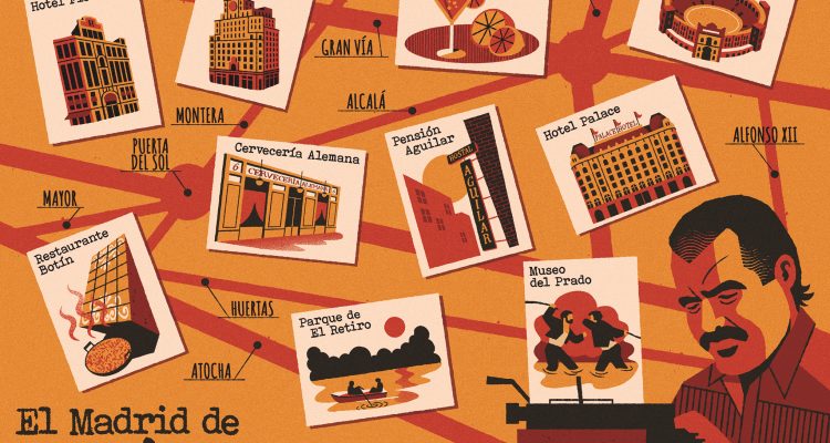 El mapa de Daniel Diosdado refleja los rincones emblemáticos del escritor norteamericano en Madrid: El Hotel Florida, el Museo Chicote, la Plaza de Toros de las Ventas, el Museo del Prado o el Hotel Palace entre otros.