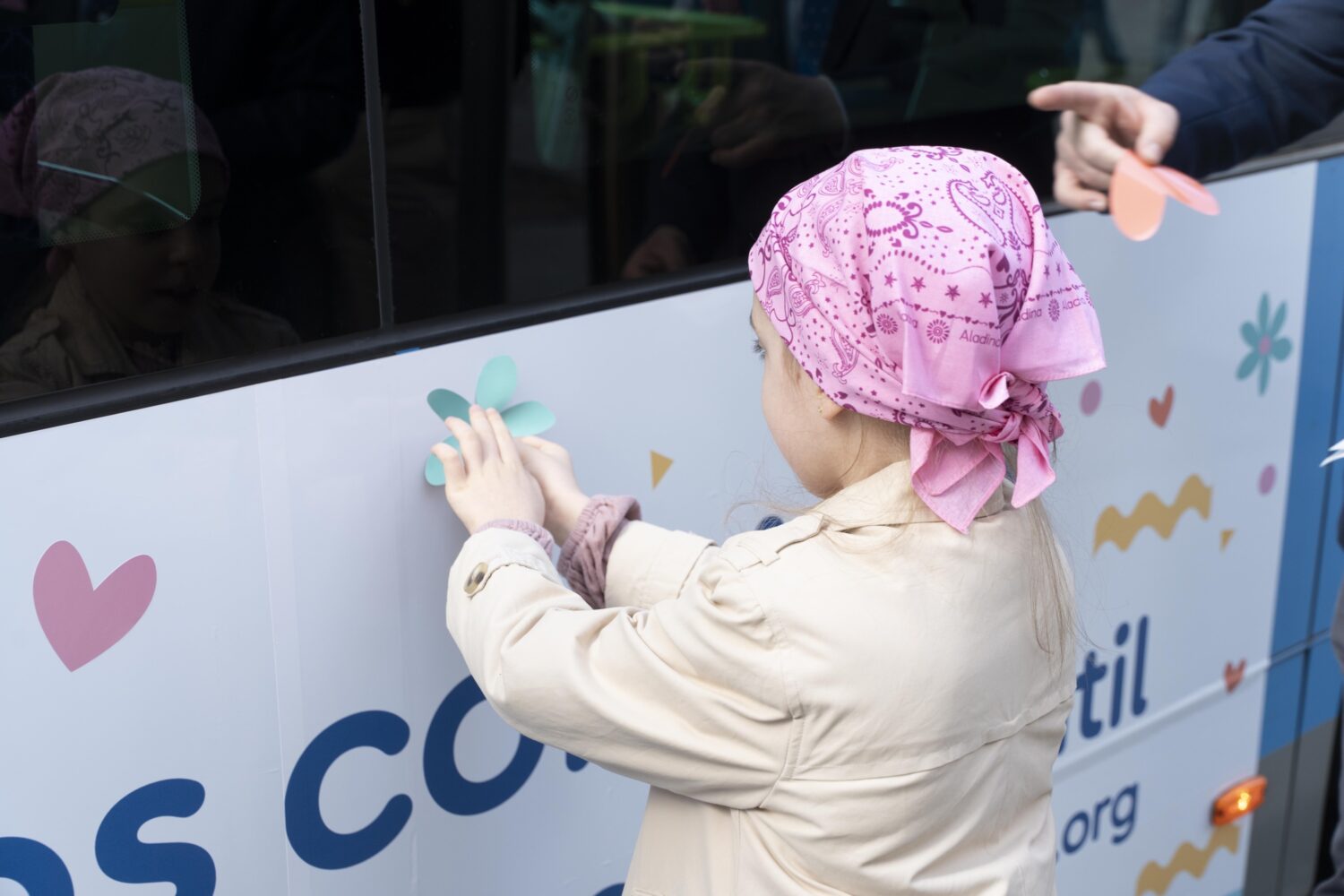 Como ya ha ocurrido en años anteriores, la empresa municipal ha querido impulsar la iniciativa #pañueloChallengeAladina para lograr que particulares, empresas y colegios se sumen a este gesto solidario de apoyo a menores afectados por el cáncer. La creatividad elegida para vinilar el autobús de EMT Madrid lleva la imagen de tres niñas –Arianny, Alana y Noa– y va acompañada del mensaje de ánimo ¡Contamos contigo!.
