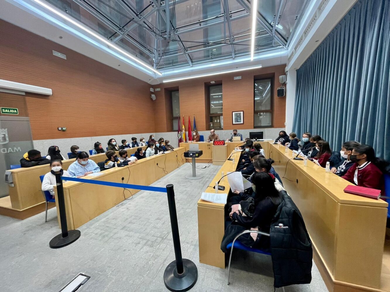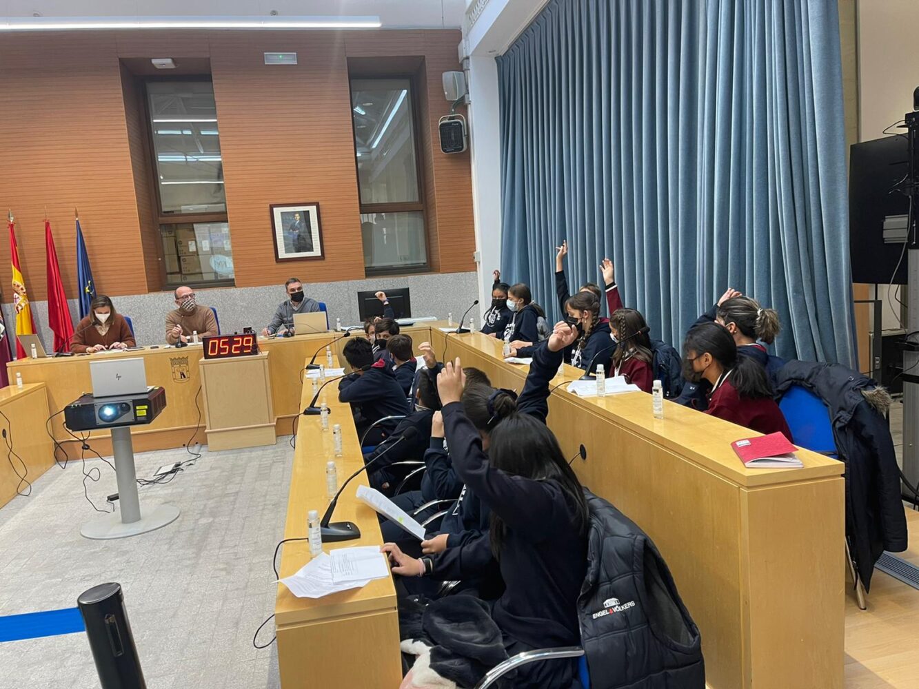 Esta mañana, el Salón de Plenos de la Junta Municipal de Centro ha acogido la celebración de un pleno infantil en el que han participado 56 alumnos de sexto de Primaria, la mayoría de manera presencial y el resto vía telemática, pertenecientes a los centros educativos Santa María y Madres Mercedarias de Don Juan de Alarcón. Al igual que los plenos ordinarios, el infantil ha estado presidido por el concejal del distrito, José Fernández, y han sido convocados un portavoz de cada grupo político.