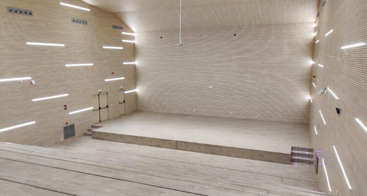 El diseño del edificio contempla dos zonas claramente diferenciadas y distribuidas en dos plantas sobre rasante y un sótano, todas ellas comunicadas tanto mediante escaleras como por ascensor. Una de las zonas está destinada al desarrollo de las actividades docentes de la escuela y dispone de espacios para uso administrativo y aulas situadas en las dos plantas superiores, así como un aula de cámara en la planta inferior. La otra área está planteada para el desarrollo de actuaciones y cuenta con un gran auditorio que dispone de vestuarios y baños, guardarropa, almacén y un acceso exclusivo para artistas.