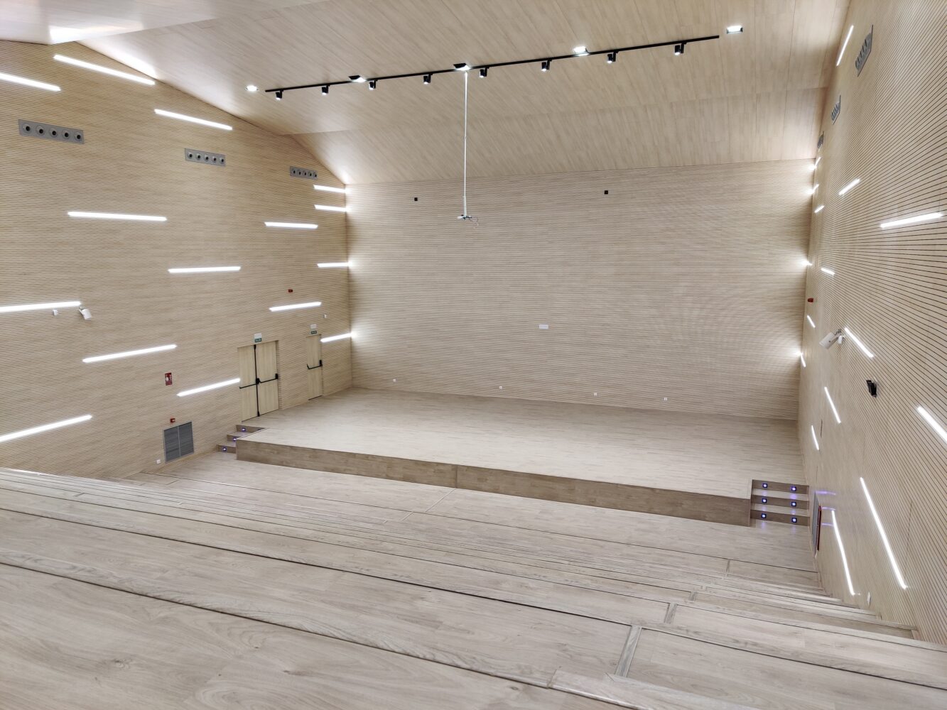 El diseño del edificio contempla dos zonas claramente diferenciadas y distribuidas en dos plantas sobre rasante y un sótano, todas ellas comunicadas tanto mediante escaleras como por ascensor. Una de las zonas está destinada al desarrollo de las actividades docentes de la escuela y dispone de espacios para uso administrativo y aulas situadas en las dos plantas superiores, así como un aula de cámara en la planta inferior. La otra área está planteada para el desarrollo de actuaciones y cuenta con un gran auditorio que dispone de vestuarios y baños, guardarropa, almacén y un acceso exclusivo para artistas.