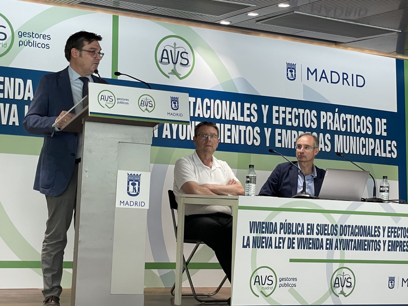 El delegado de Políticas de Vivienda y presidente de la Empresa Municipal de la Vivienda y Suelo (EMVS), Álvaro González, ha clausurado hoy la jornada sobre ‘Vivienda pública en suelos dotacionales y efectos prácticos de la nueva Ley de Vivienda en ayuntamientos y empresas municipales’, organizada por la Asociación de Gestores Públicos de Vivienda y Suelo (AVS), de la que forma parte la empresa pública madrileña.