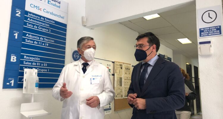 Estos profesionales sanitarios, dependientes de Madrid Salud, han informado al concejal del proceso de vacunación contra la COVID-19 que se lleva a cabo en el centro, asignado para inmunizar a los trabajadores de dispositivos sociosanitarios del distrito como ayuda a domicilio, centros de día y escuelas infantiles, entre otros.