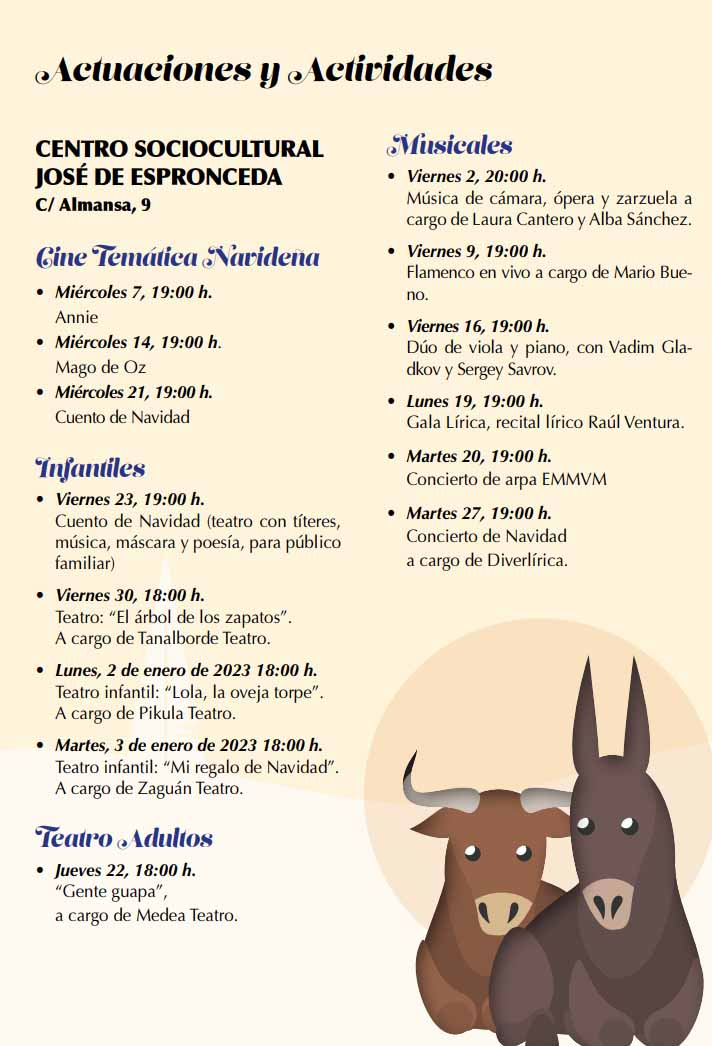 El Centro Sociocultural José de Espronceda, calle de Almansa, 9, acoge un ciclo de cine de temática navideña los miércoles de diciembre, a las 19:00 h, con la proyección del Mago de Oz mañana, 14 de diciembre, y Cuento de Navidad, el día 21.