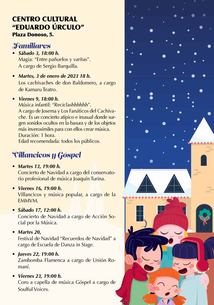Además, durante las vacaciones escolares de los más pequeños se ha programado teatro infantil con Cuento de Navidad el próximo viernes 23, a las 19:00 h. Las siguientes sesiones de este ciclo tendrán lugar a las 18:00 h y serán: El árbol de los zapatos, a cargo de Tanalborde Teatro (viernes 30); Lola, la oveja torpe, por Pikula Teatro (lunes, 2 de enero), y Mi regalo de Navidad, representada por Zaguán Teatro, el martes, 3 de enero a las 18:00 h.