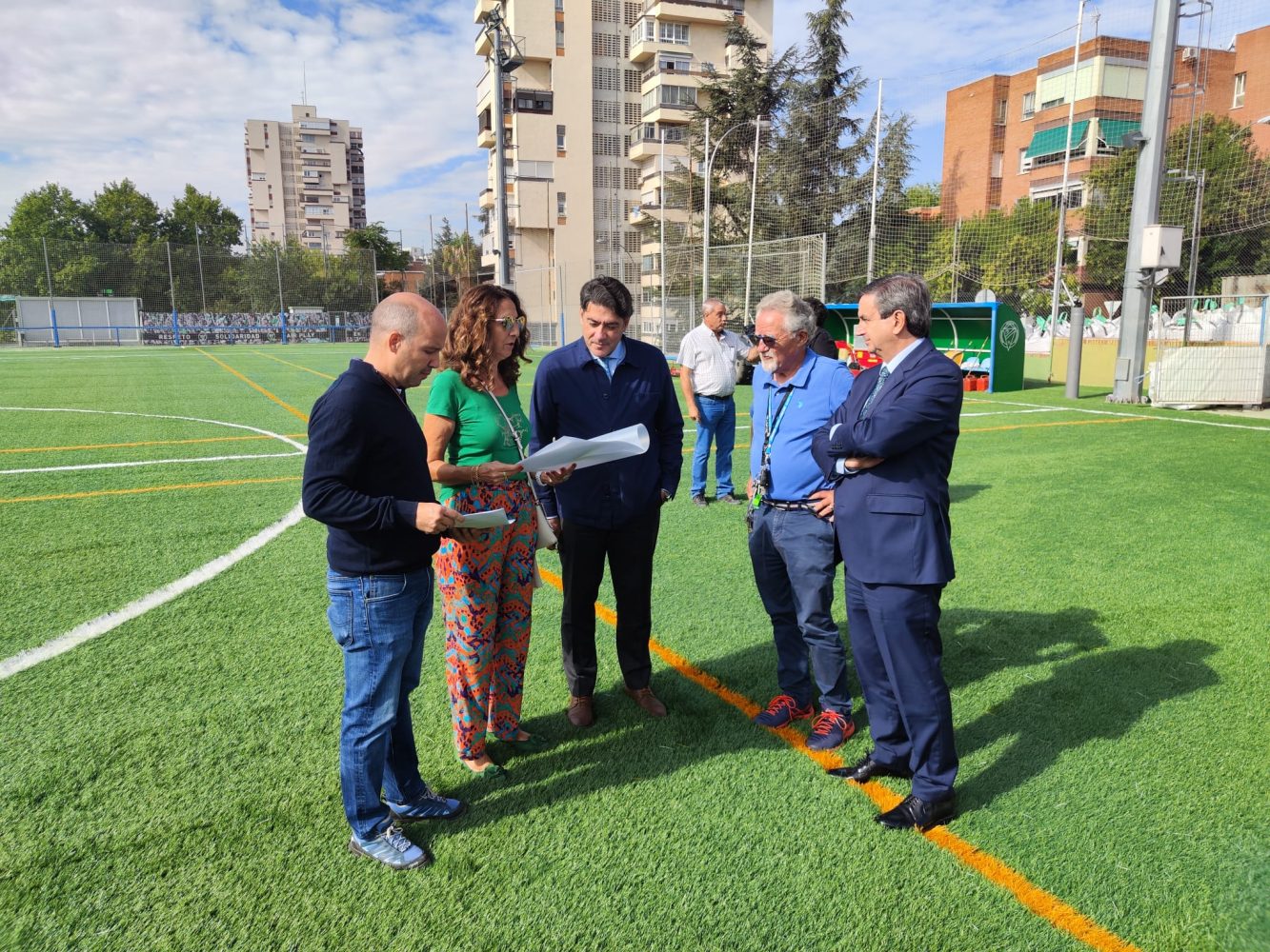 El concejal de Hortaleza, David Pérez, ha visitado hoy las obras de mejora de la Instalación Deportiva Básica Esperanza I, donde se está sustituyendo el césped artificial del campo de fútbol 11, “dejándolo en las mejores condiciones para el comienzo de la temporada”.