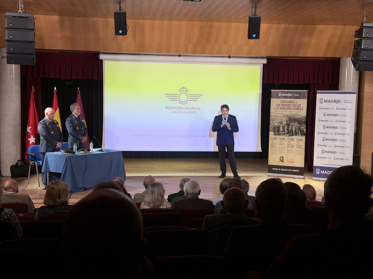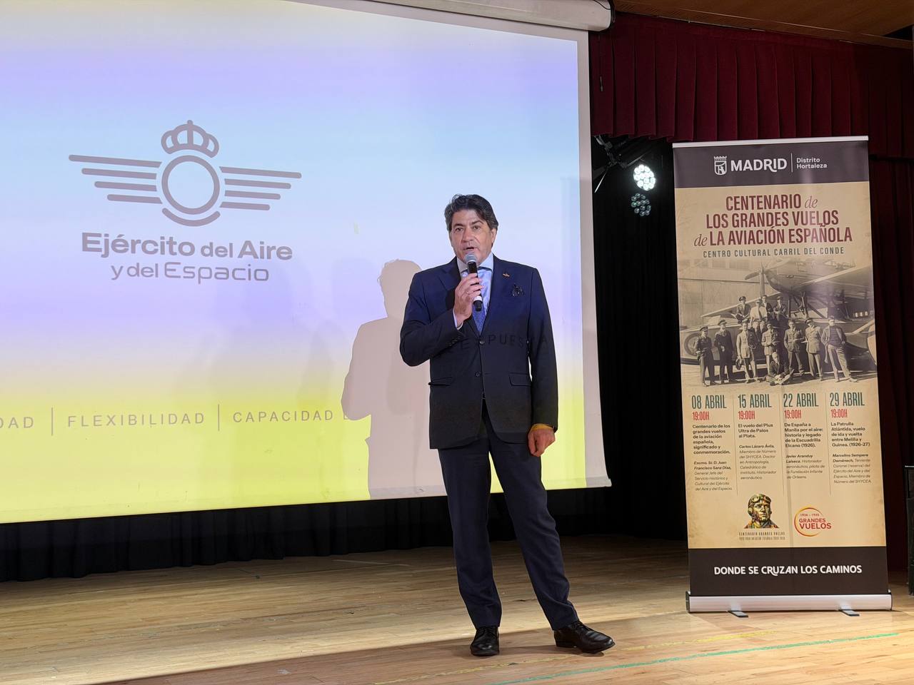 El concejal de Hortaleza, David Pérez, ha inaugurado hoy la conferencia ‘Centenario de los grandes vuelos de la aviación española, significado y conmemoración’, dentro de un ciclo divulgativo organizado por la junta municipal para dar a conocer el significado de esta efeméride, así como los principales hitos de la aviación española, en el Centro Cultural Carril del Conde. En la jornada de hoy, a cargo del general jefe del Servicio Histórico y Cultural del Ejército del Aire y del Espacio, Juan Francisco Sanz, se ha abordado el significado histórico, institucional y cultural de los grandes vuelos de la aviación española.