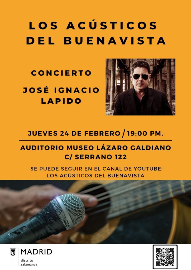 Tras el parón navideño, el 24 de febrero vuelve el ciclo de conciertos de Los Acústicos del Buenavista organizado por la Junta Municipal del Distrito de Salamanca. Este mes, en la tercera edición de este ciclo, el invitado será uno de los nombres imprescindibles de la música rock de nuestro país, José Ignacio Lapido. Musicalmente más conocido como Lapido, el guitarrista y compositor ha sido componente de la célebre banda 091, además de ser considerado como uno de los mejores compositores del rock nacional.
