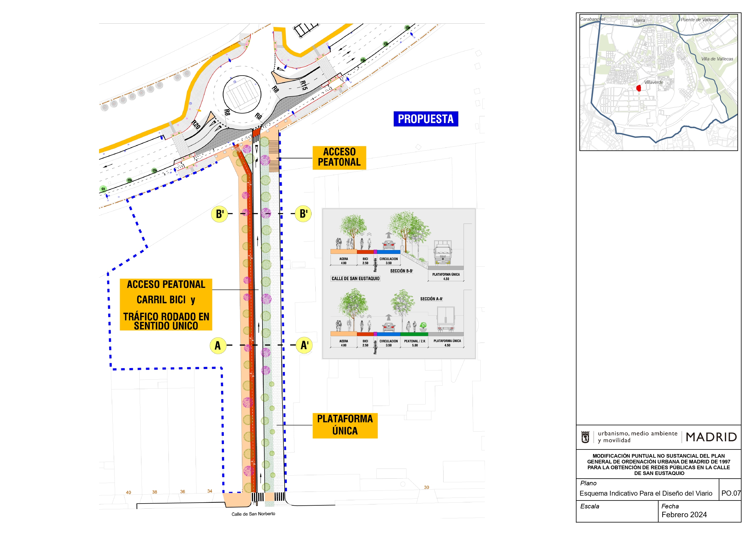 En paralelo y fuera del ámbito objeto de la modificación del PGOUM, se han definido zonas en las que se propone llevar a cabo actuaciones complementarias de mejora de la urbanización de la red viaria existente. Para ello, se procederá a la reurbanización de la intersección entre las calles de San Eustaquio y de San Norberto, eliminando el aparcamiento existente, creando un nuevo espacio ajardinado y reorganizando la circulación peatonal para facilitar su movilidad entre el bulevar de la calle de San Eustaquio y su ampliación en el tramo norte de la vía.