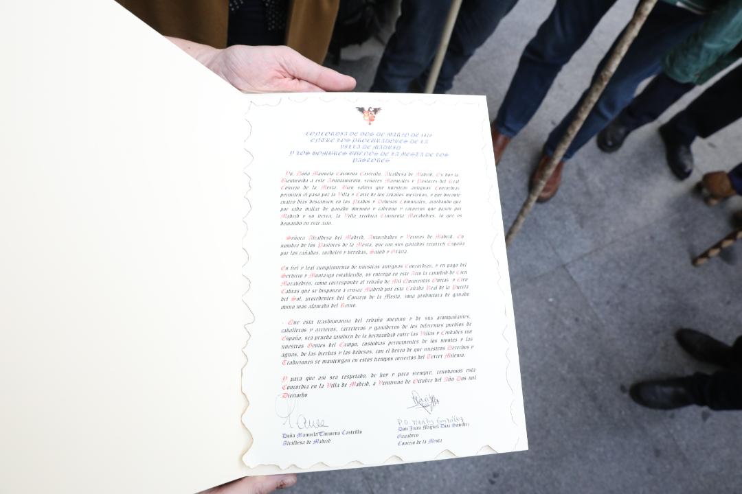 Los pastores de los rebaños de ovejas merinas han entregado a la alcaldesa los “50 maravedís al millar” estipulados por la Concordia de 2 de marzo de 1418 entre los Hombres Buenos de la Mesta y los Procuradores del Concejo de la Villa en concepto del derecho de paso de los rebaños por la capital.