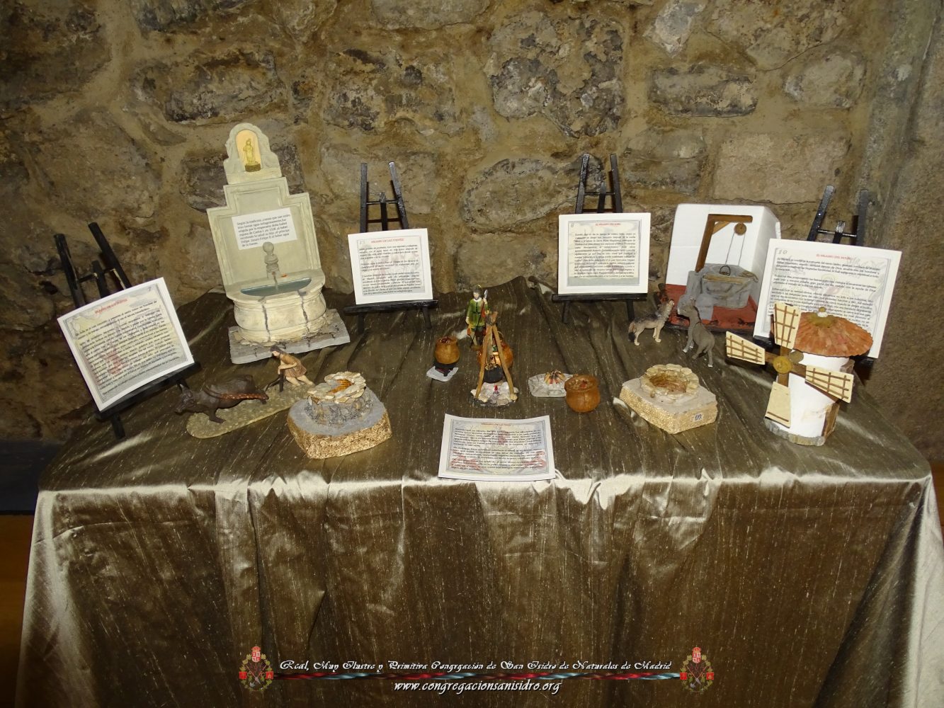 La exposición conformada por más de 100 objetos, cuenta con piezas emblemáticas y de gran valor histórico propiedad de la Real Congregación de San Isidro Labrador, cedidas especialmente para esta ocasión. Entre las piezas que se pueden encontrar, destaca el estandarte del siglo XVIII de la Real Congregación, numerosas litografías, así como una pareja de santos vestidos que representan a San Isidro y a Santa María de la Cabeza, realizados por el famoso belenista José Luis Mayo, quien las ha cedido para esta exposición.