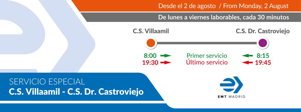 La Empresa Municipal de Transportes de Madrid, previa autorización del Consorcio Regional de Transportes de Madrid, va a poner en funcionamiento el próximo lunes, 2 de agosto, el Servicio Especial C.S. Villaamil – C.S. Dr. Castroviejo. Se trata de un servicio de lanzadera rápido que conectará el centro de salud Villaamil, que actualmente permanece cerrado, con el centro de salud Doctor Castroviejo. El servicio especial, que será gratuito para los viajeros, se mantendrá el tiempo que sea necesario para garantizar la movilidad de los usuarios.