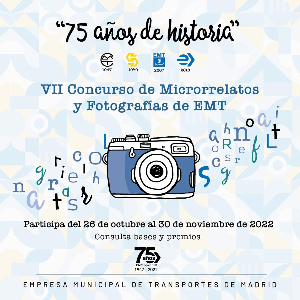 La Empresa Municipal de Transportes de Madrid (EMT) convoca la séptima edición del Concurso de Microrrelatos y Fotografías que este año tiene por objetivo celebrar los 75 años de historia de la empresa municipal al servicio del transporte de viajeros en Madrid. Los participantes de esta séptima edición tienen desde hoy la posibilidad de optar a diversos premios en metálico para las modalidades de microrrelato y fotografías. Además, los seguidores de Facebook e Instagram podrán elegir por votación sus fotos y relatos favoritos. El plazo de presentación de los trabajos, para ambas modalidades, comienza hoy, 26 de octubre, y finaliza el próximo 30 de noviembre.