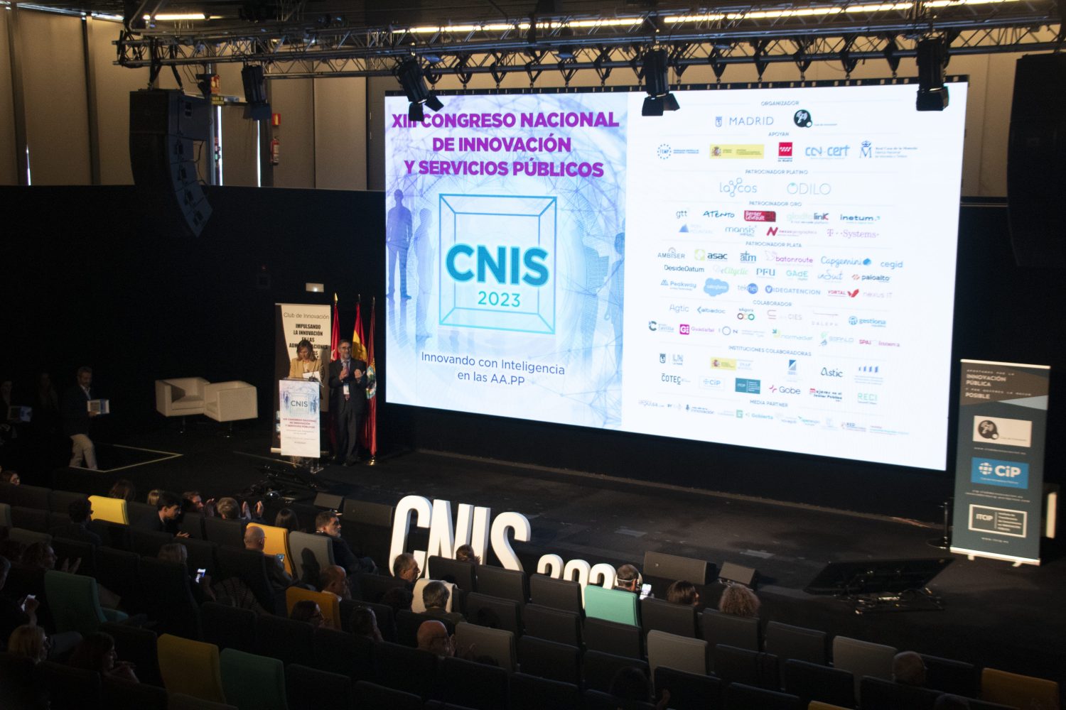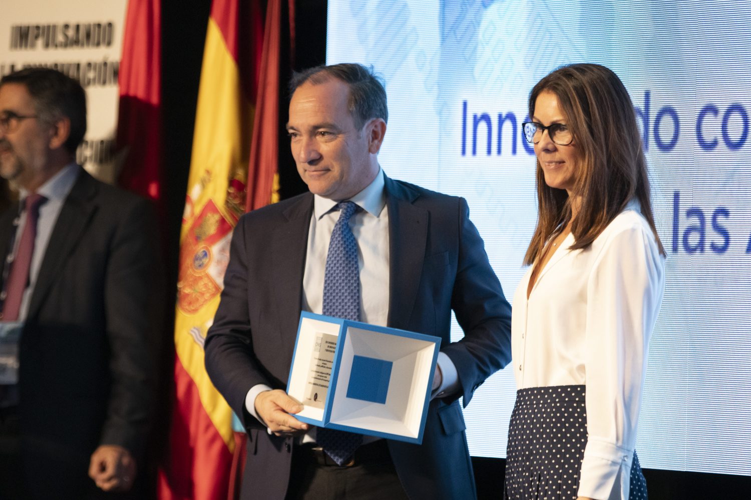 El delegado de Urbanismo, Medio Ambiente y Movilidad, Borja Carabante, en compañía del director gerente de la Empresa Municipal de Transportes (EMT), Alfonso Sánchez, ha recogido hoy el Premio del Congreso Nacional de Innovación y Servicios Públicos (CNIS) a la EMT, en la categoría de Mejor proyecto financiado con fondos europeos, por la actual estrategia de la empresa municipal para la descarbonización de la flota municipal de autobuses y la adaptación tecnológica de sus instalaciones.