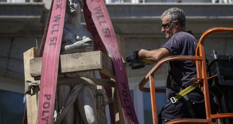 La estatua de la Mariblanca ha sido trasladada esta tarde a su nueva ubicación en la Puerta del Sol. La escultura, que se ha desplazado 18 metros respecto de su emplazamiento anterior, ocupará a partir de ahora el extremo occidental de la nueva alineación de bancos situada en el arco norte de la plaza.
